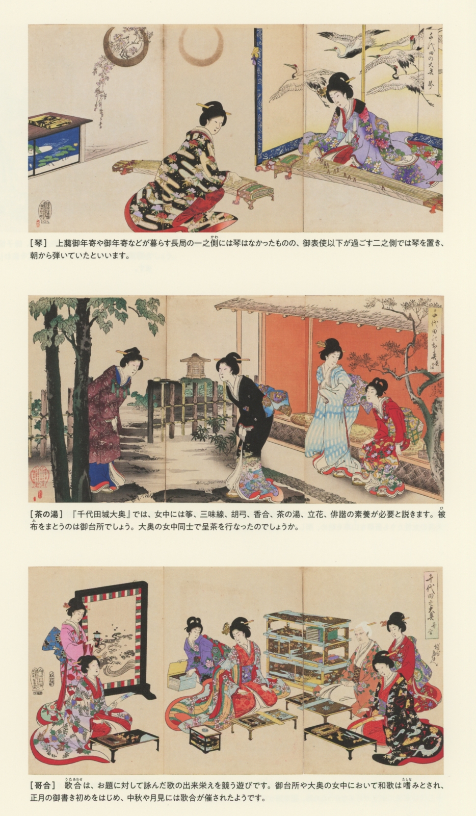 左から。楊洲周延の「千代田の大奥(抄)」。1894年になってから刊行された、全40図のセット。ここでは3点だけご紹介。「幻想の明治」ならぬ「幻想の江戸時代/幻想の大奥」であり、ロングセラーとなったという。