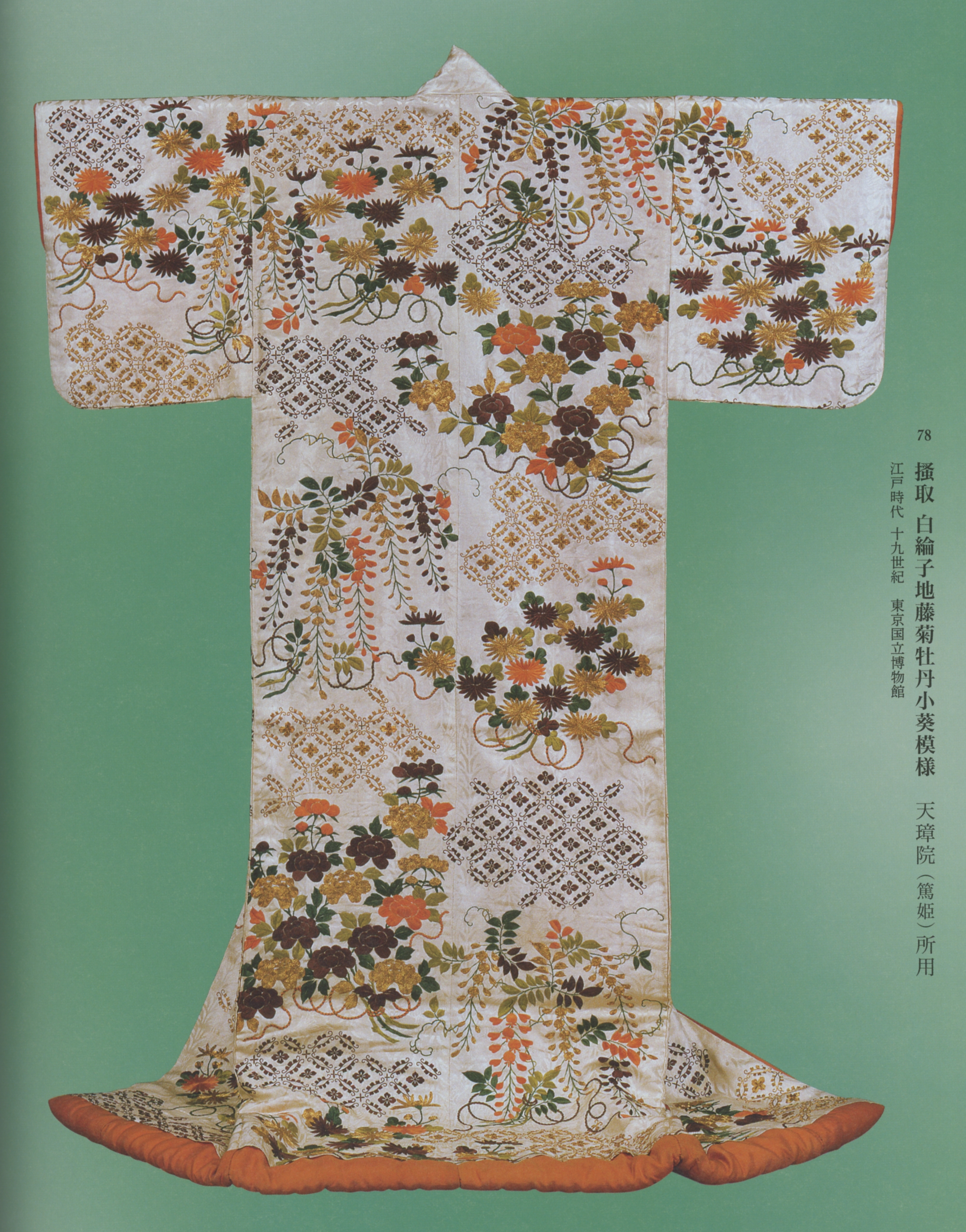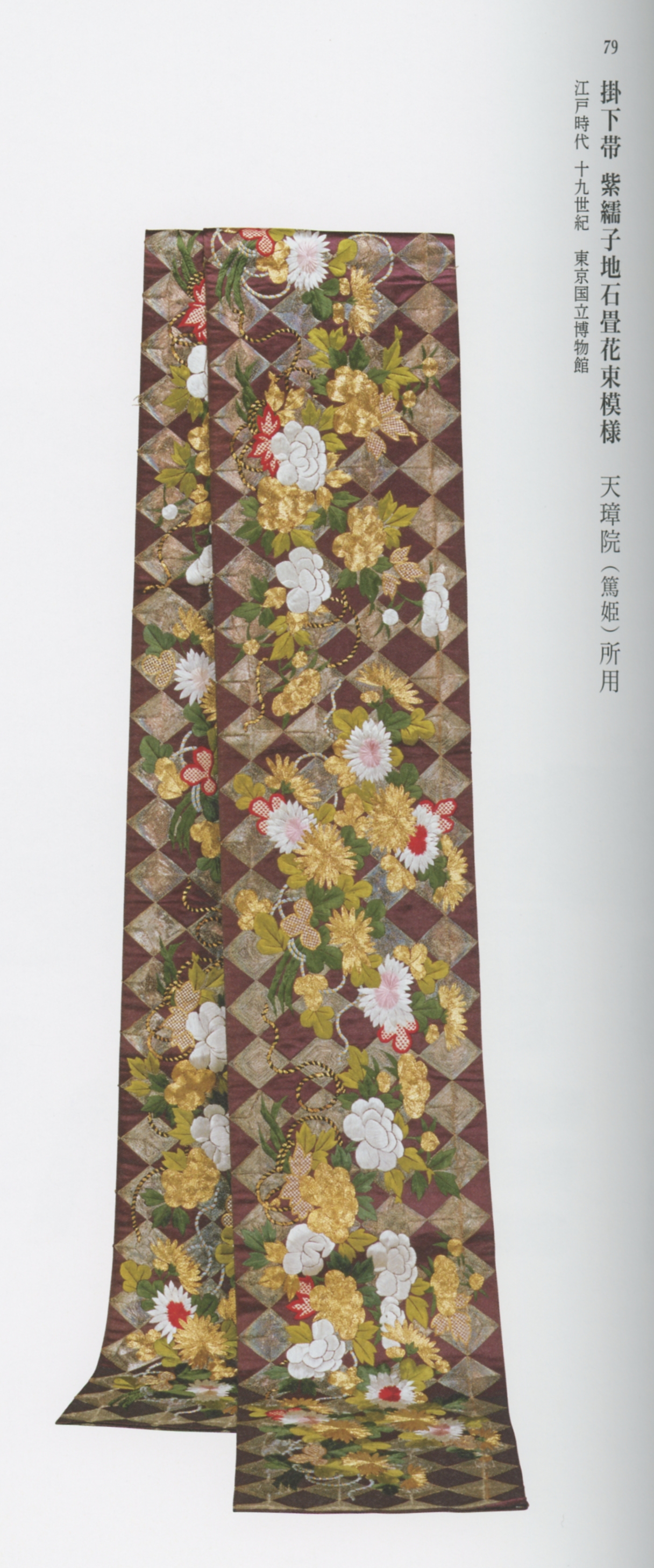今回、衣裳の展示が非常に多く、そして私はどの展覧会でも大体衣裳系はスルーしがちなのであるが [;_ _](この展覧会に当初あまり惹かれていなかったのは、衣裳系がメインだろうと予想していたからなのだが、)中にはやはり目を瞠(みは)るほど素晴らしいものも(当然ながら)ある。天璋院(篤姫)所用の「掻取 白綸子地藤菊牡丹小葵模様」と、同じく「掛下帯 紫繻子地石畳花束模様」なのだが..これまた、図録からのスキャンでは、どうにもこうにも..[;_ _] どこに感動したのか、伝わらないだろうなぁ..[;_ _]