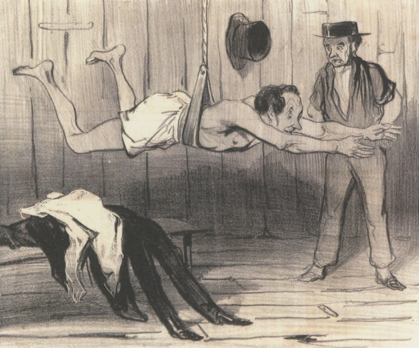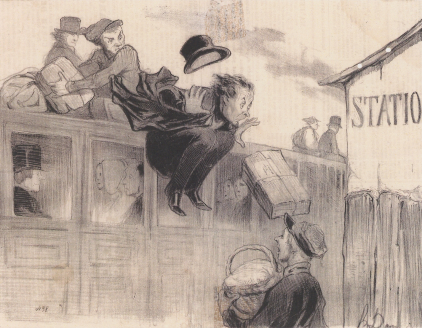 「ドーミエ、どう見える?」展の作品からは、絵葉書を買えた2点を、スキャンしてご紹介。左から、「 『鉄道』より「30秒の停車。」」、「『泳ぐ人たち』より「水泳の訓練。」」。前者には「ほら、ジョゼフ!…おまえに渡すものはこれで全部だ。小包3つと乗客ひとり。小包は特に丁寧に扱ってな!…」、というテキストが付けられている。後者に付けられているテキスト(キャプション)は、撮影し忘れた。[;^J^]