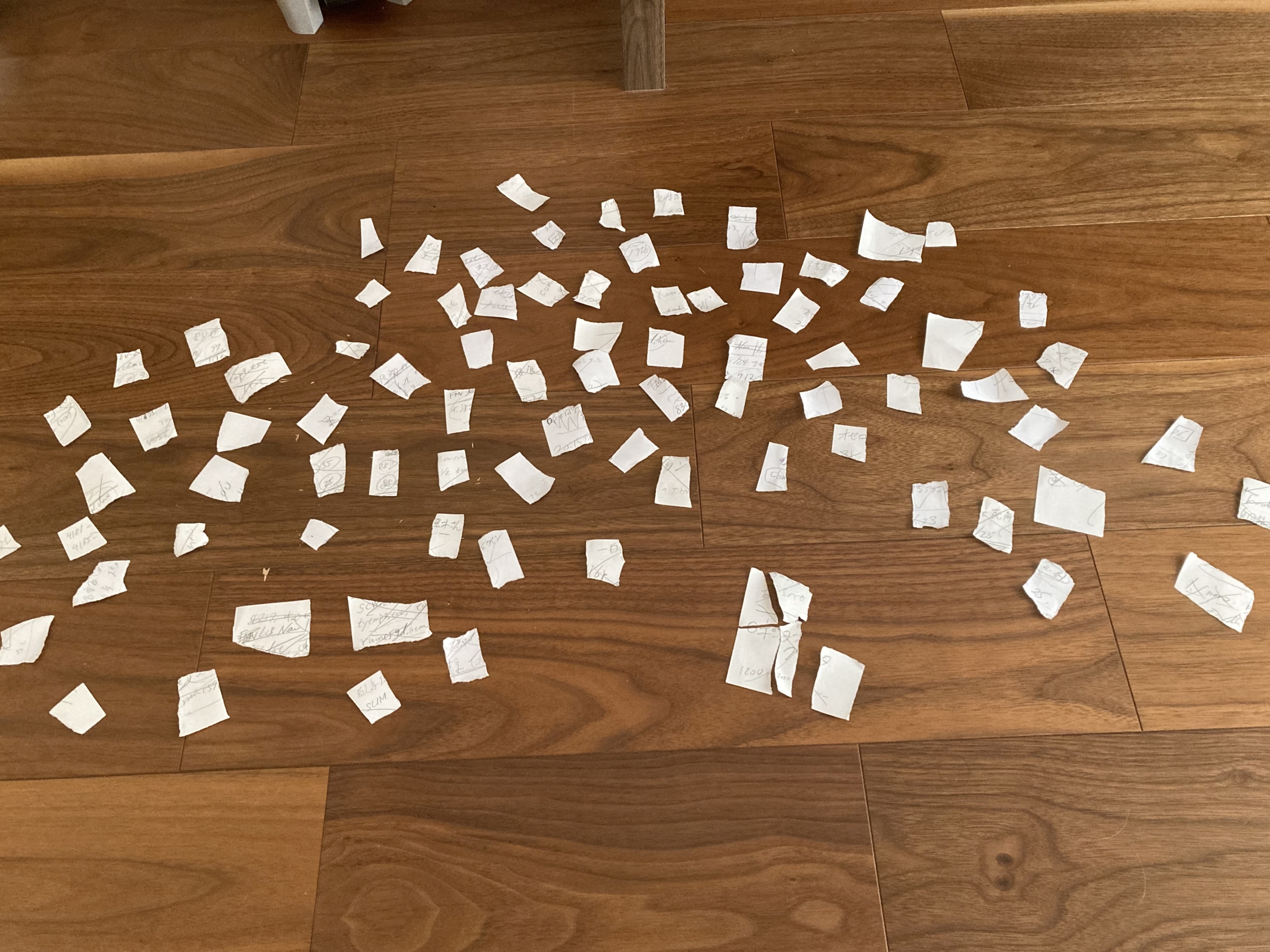 思い出せないが、なにか大事な要件のメモをうっかり破ってゴミ箱に捨ててしまったような気がして不安になってゴミ箱をひっくり返し、6枚のメモ用紙を各16片に破った紙片(計96枚)を、2時間以上かけてジグゾー復元。[;^.^](不適切な個所にはモザイクかけてます。[^.^])
