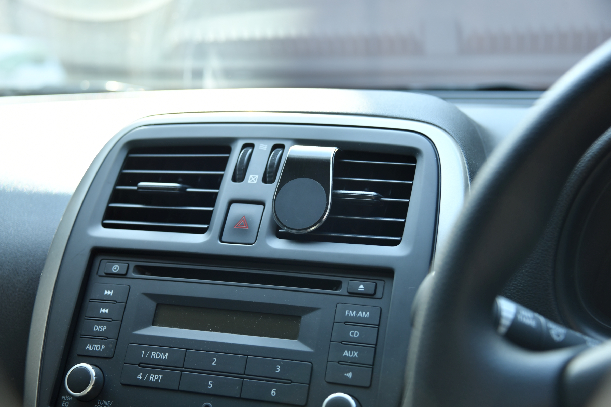 問題点はふたつ。まず、エアコンと完全に干渉していること [;^J^]。次に、iPhone の手帳型のケースが、カーステレオのパネルを覆ってしまうこと [;^.^]。後者について言えば、CD を入れ替えるときにまくればいいだけのことであるし(それ以外の用途で、操作パネルを触ることはない。また、iPhone を手帳型のケースからいちいち取り出して設置するのは面倒でもある)、前者については..事態が深刻になるまでは、先送りすることにしよう。[;_ _][;^.^](ハザードランプスイッチが隠れることを心配されるかも知れないが、iPhone は磁石で貼りついているだけなので、クルリと90度回転させて、ハザードランプスイッチを露出させることができるのだ。)