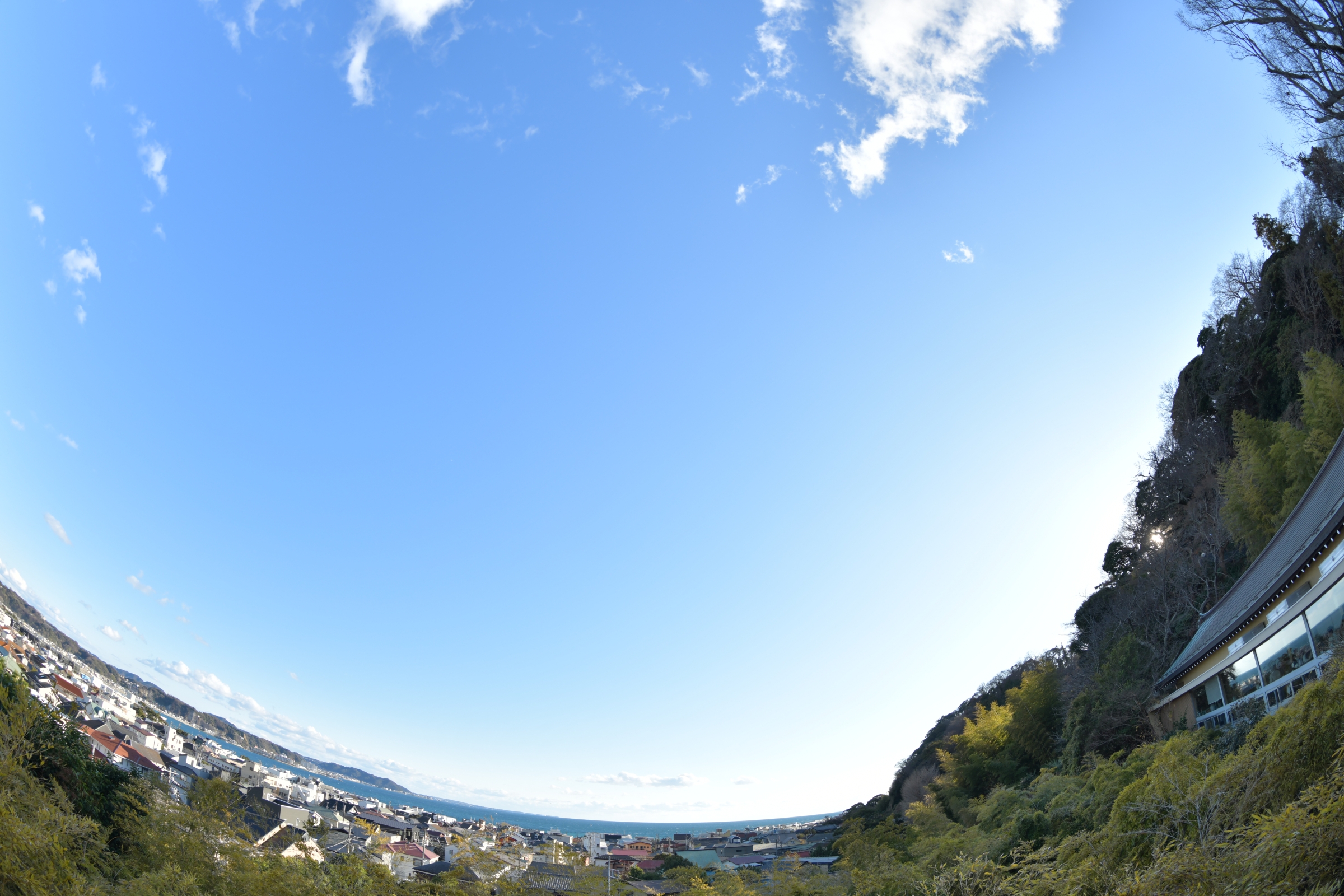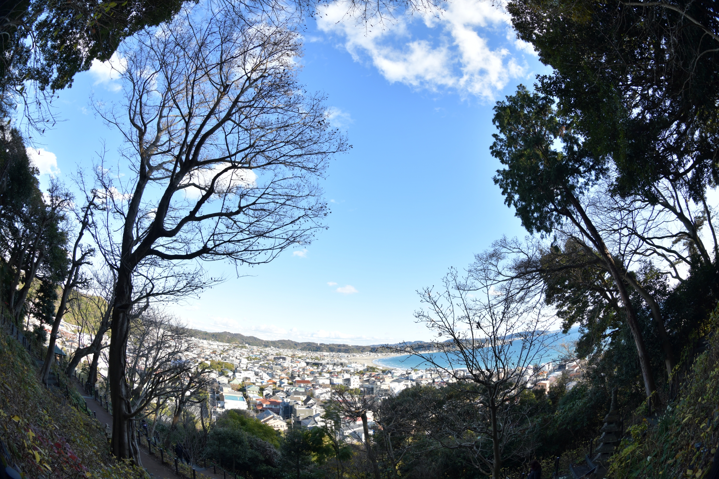 左写真は眺望散策路、中写真は見晴台から撮影。御覧のとおり、今年は魚眼メインである。