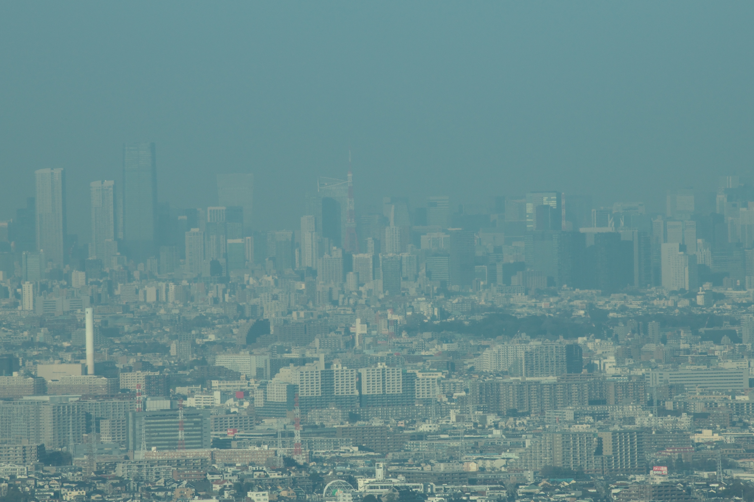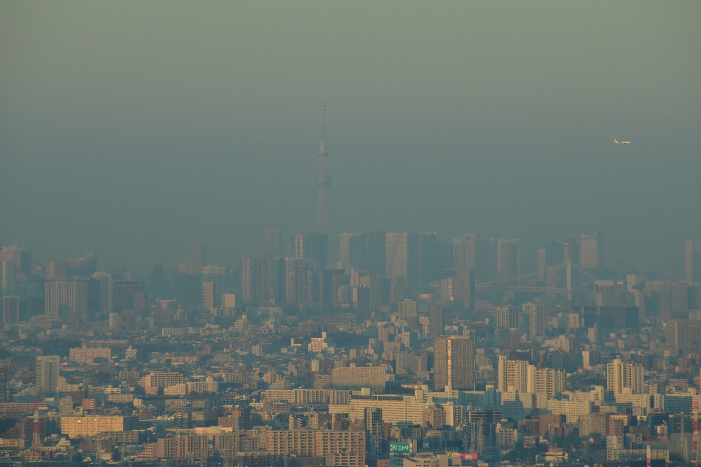 今日もガスっぽいのだが、地平線際の「けぶり」越しになんとかスカイツリーを視認できたので、500mm で(中写真)。