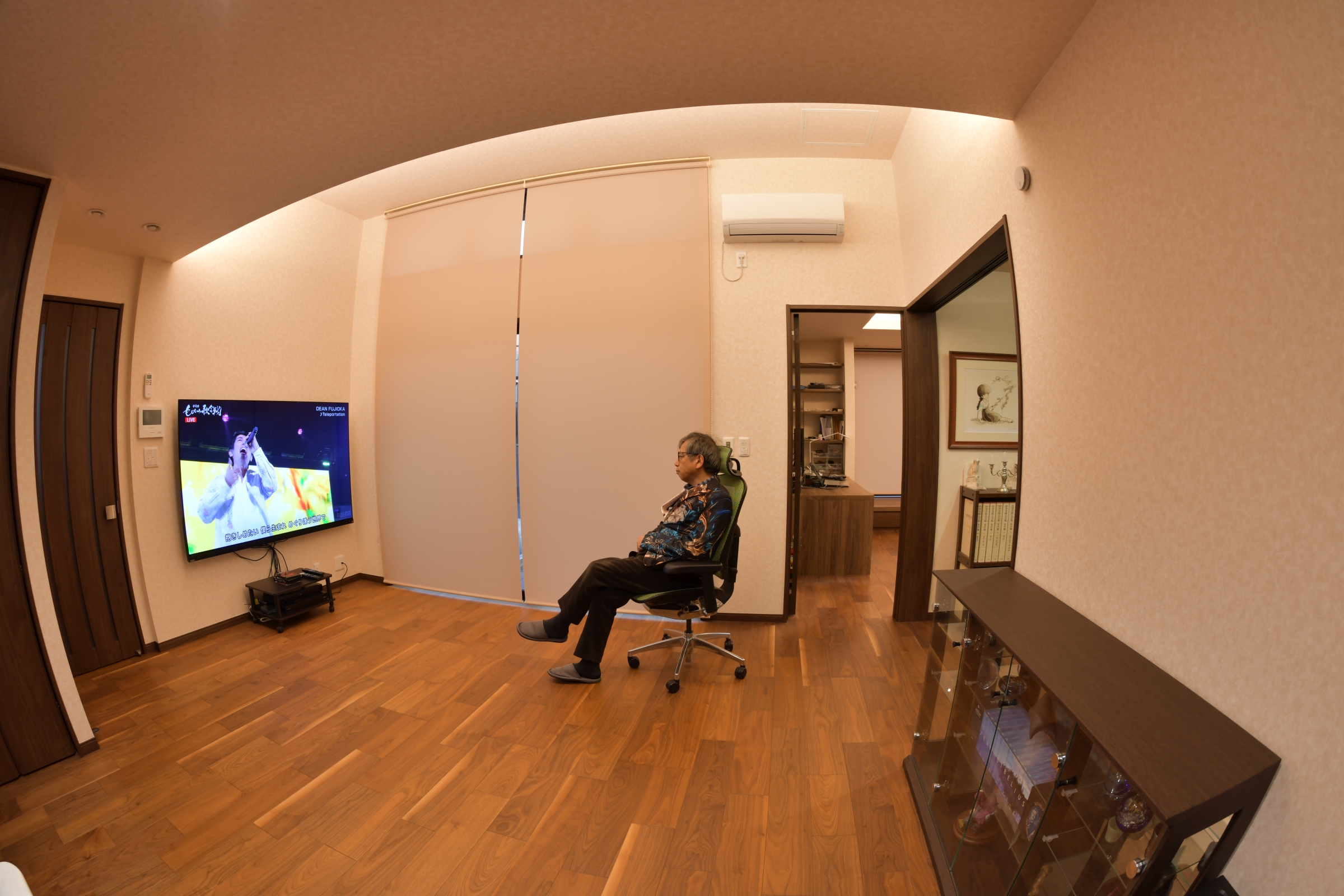 掃除の合間に、先に片づけておいたリビングに三脚を設置し、D850 に魚眼レンズ(AF-S Fisheye NIKKOR 8-15mm f/3.5-4.5E ED)をセットして、タイマー撮影。テイク20ぐらいかな。[;^.^](このジャケット、使いどころが無くて困っているのだ。演歌歌手みたいでさぁ..[;_ _][;^J^])