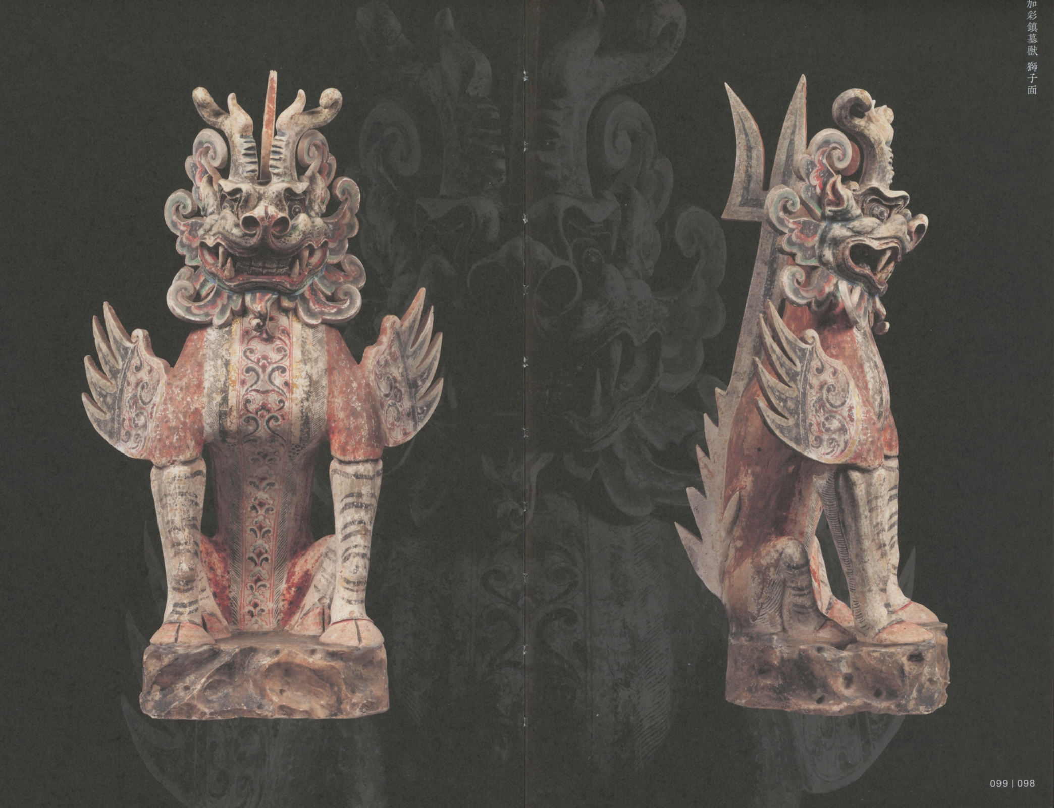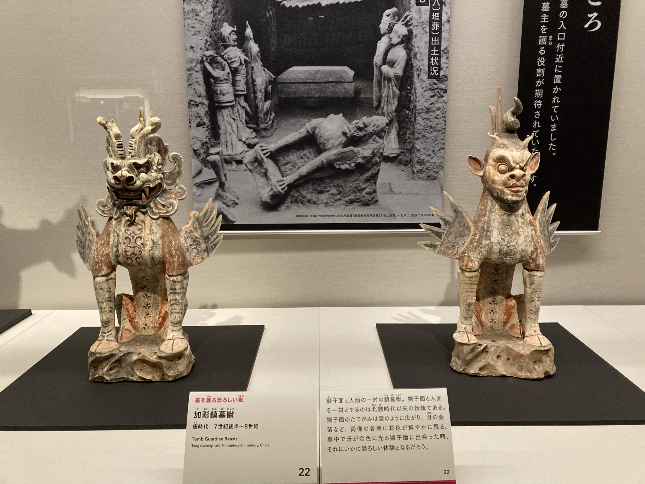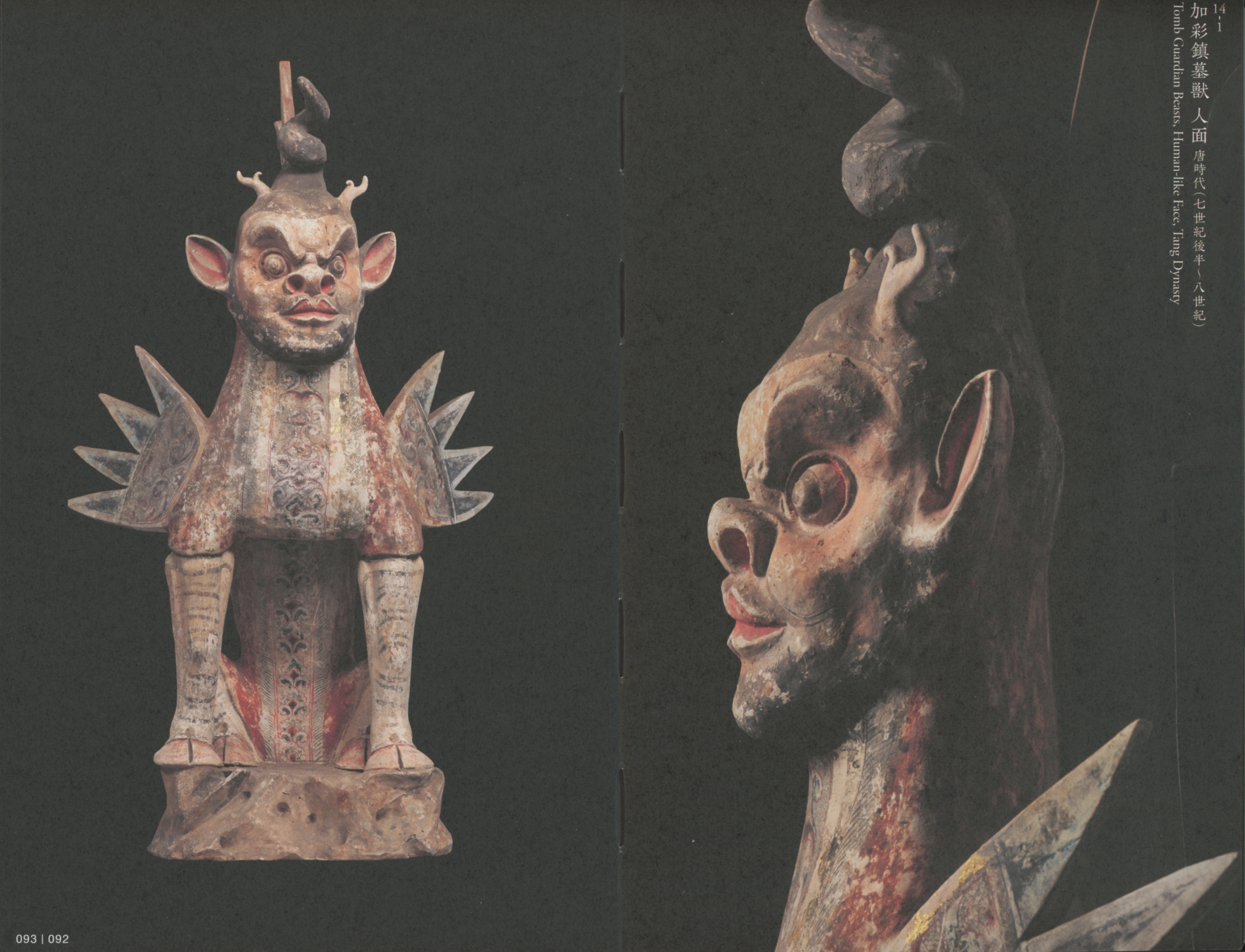 「加彩鎮墓獣」−左端写真は、展覧会場で撮ったもの。次の2枚は、図録からのスキャン。鎮墓獣とは邪気を払う聖獣であり、同じ役割の狛犬とは異なり、地下、あるいは墓の内部におかれる。スフィンクスに似ているとは言える。