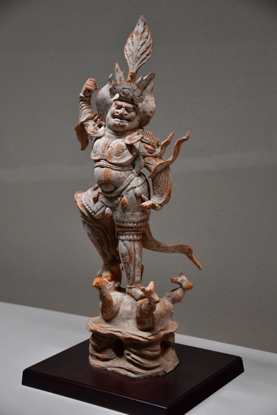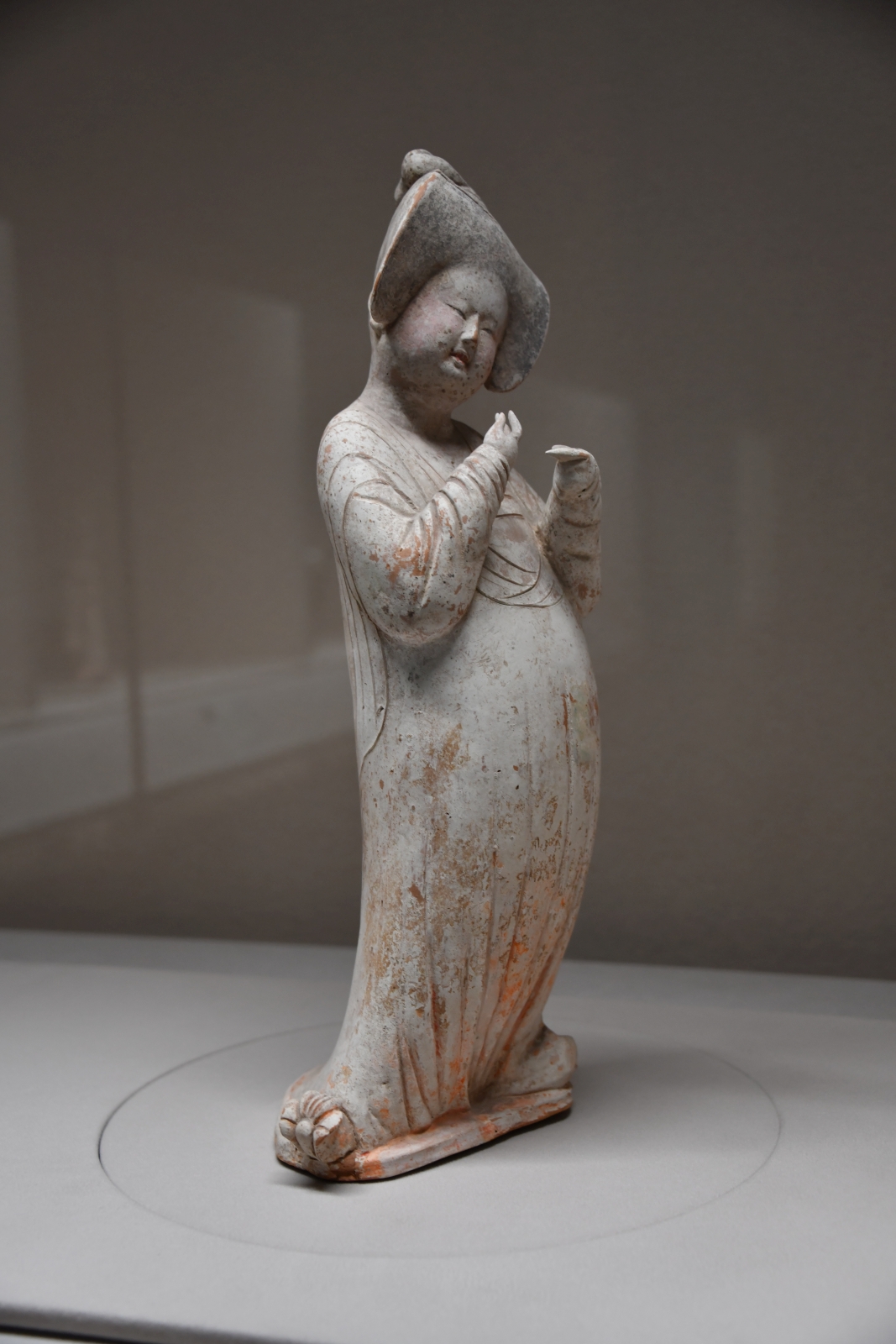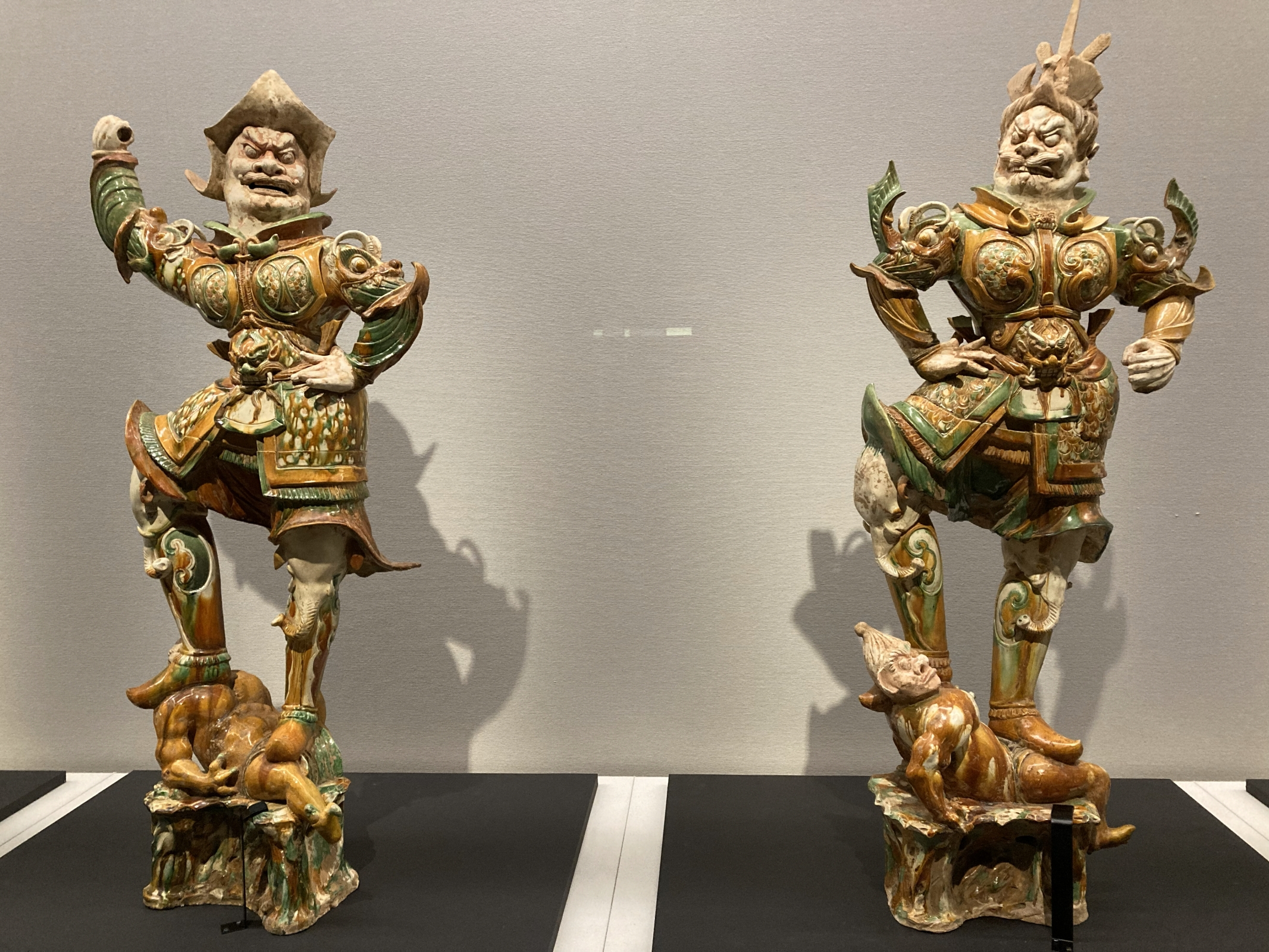 左から、「三彩 鎮墓獣」−鎮墓獣は、静嘉堂文庫美術館にも居ましたね [^J^]。「加彩 天王俑」−天王俑は、鎮墓獣どうよう、墓の入口を守るもの。「加彩 婦女俑」は、この美術館のマドンナであり、回転するお立ち台に乗っている。