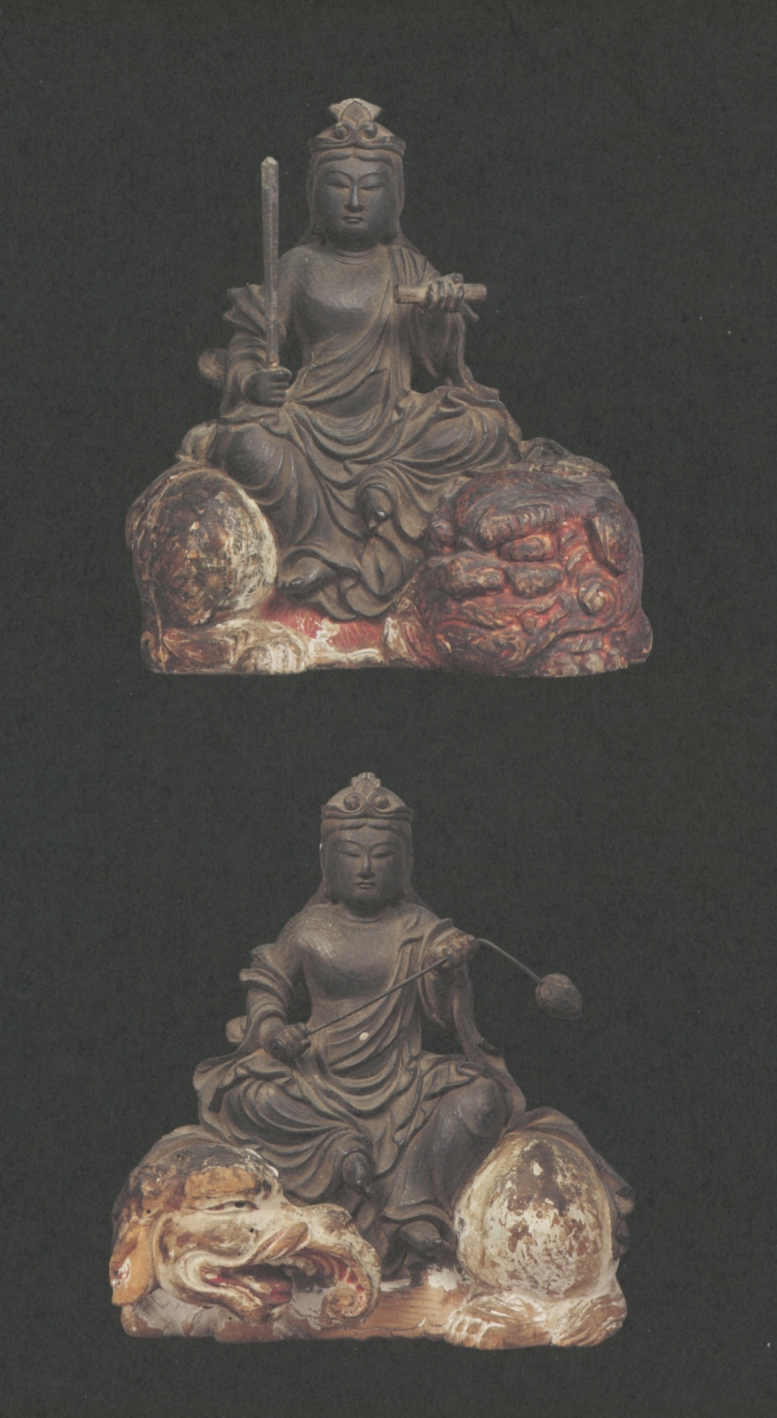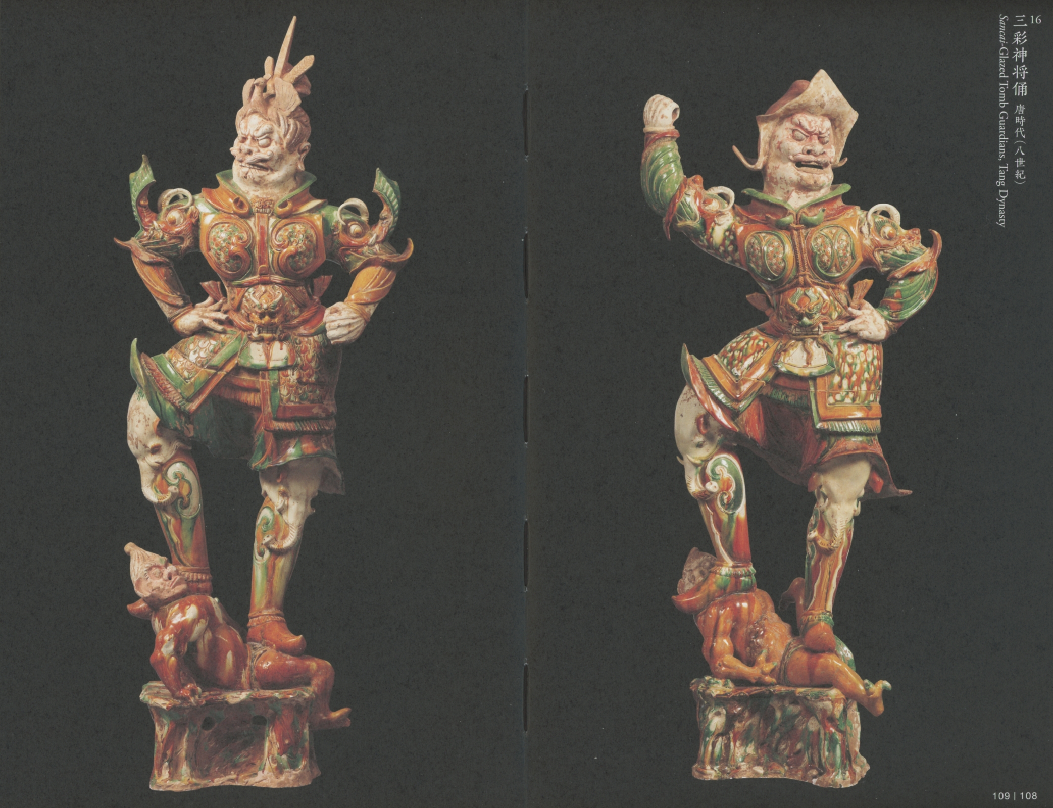左2枚は、「三彩神将俑」(写真と、図録からのスキャン)−邪鬼を踏みつけている、開口・閉口一対の俑。全身を覆う獣面の装飾が見どころである。隣の「騎獅文殊菩薩像・騎象普賢菩薩像」は対になっており、高さは16cm程度。文殊菩薩は獅子に乗っているのが言わば定型であるが、半年ほど前 ChatGPT に、獅子ならぬ「調子に乗る文殊菩薩」を描かせたのであるが、バチとか当たらないよね? [;^.^]