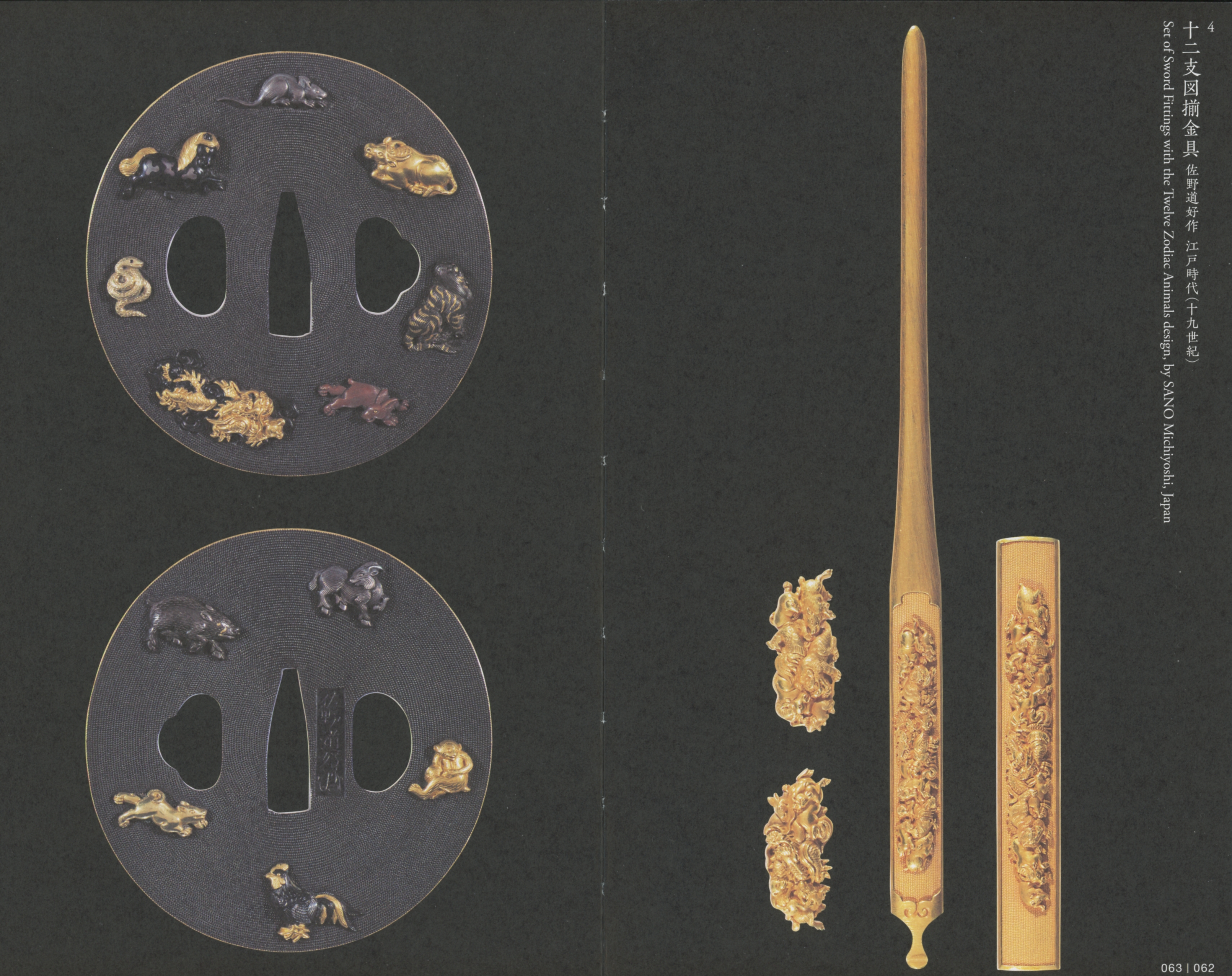 「十二支図揃金具」は、佐野道好の手になる鐔(つば)と三所物(みところもの=目貫(めぬき)、小柄(こづか)、笄(こうがい))で、十二支獣が精緻に掘り込まれている。