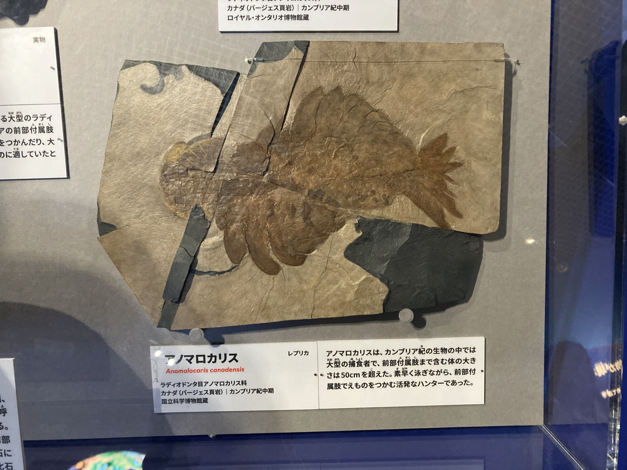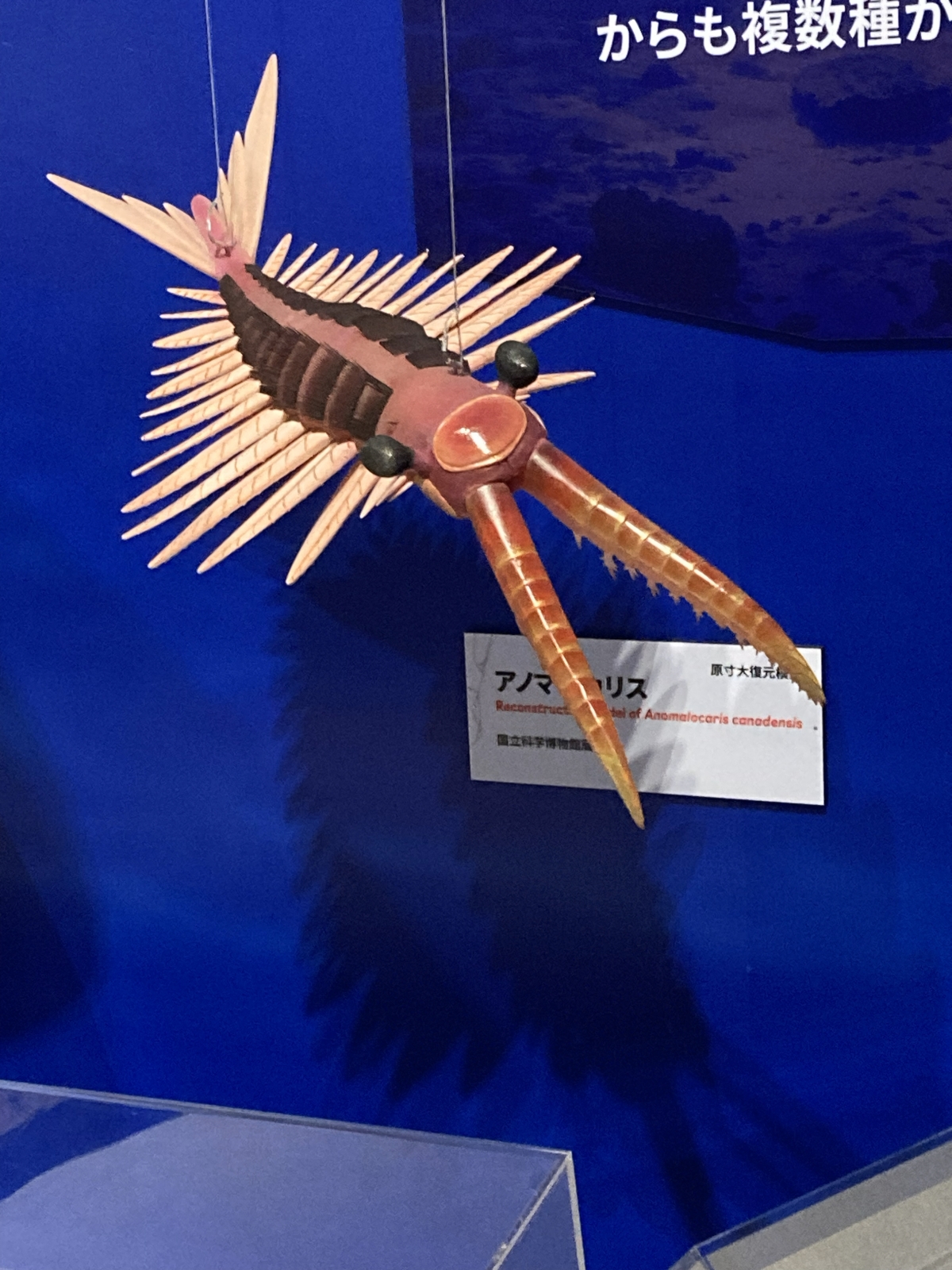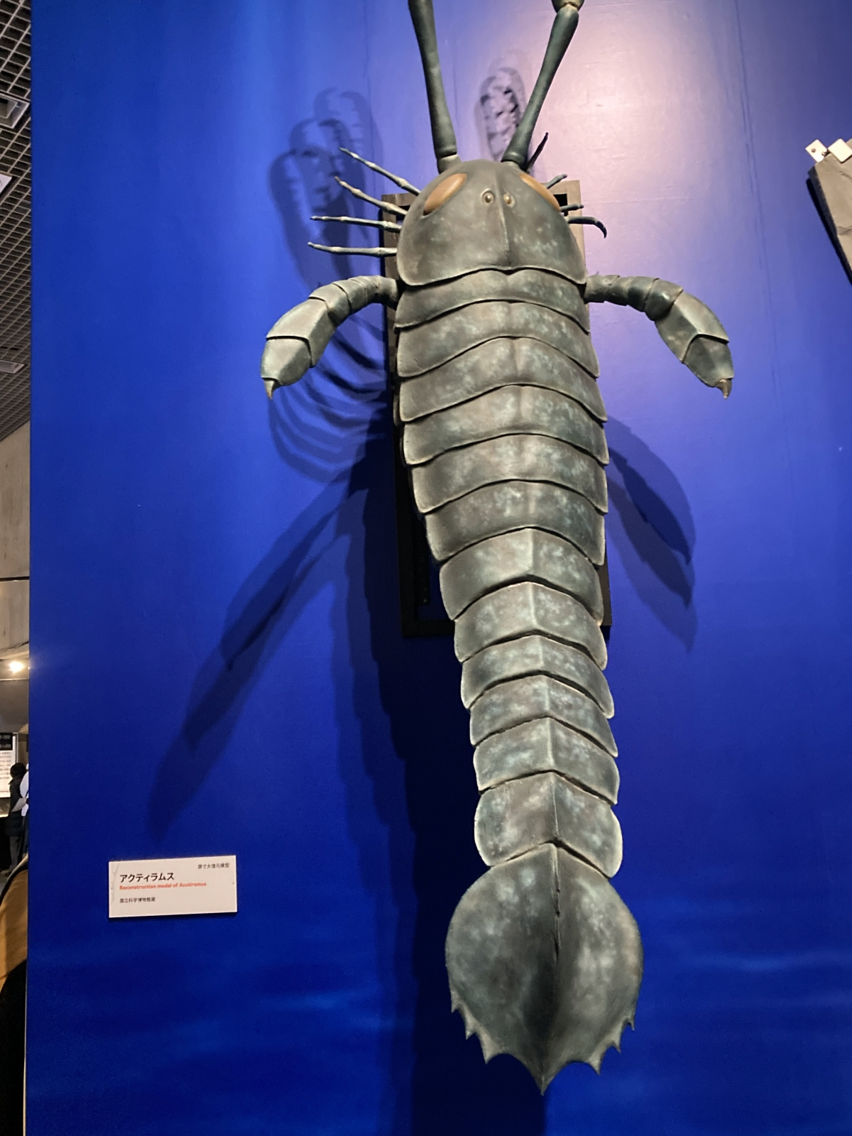 左2つは、カンブリア紀のアノマロカリスの化石のレプリカと、原寸大復元模型。右は、シルル紀のアクティラムスの原寸大復元模型。