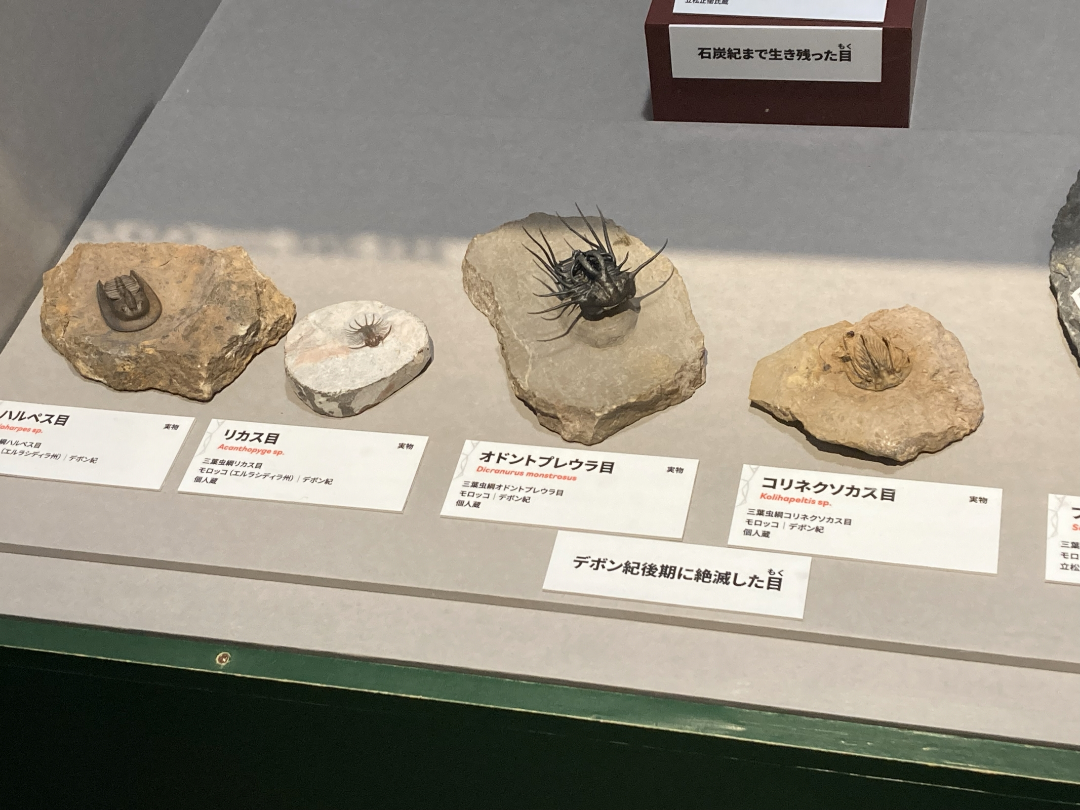さまざまな時代に絶滅した、さまざまな三葉虫たち。左写真は、ファコプス目。中写真は、ハルペス目、リカス目、オドントプレウラ目、コリネクソカス目。右写真が、石炭紀まで生き残ったプロエタス目で、われわれが「三葉虫」として普通に想起する形態は、これであろう。オドントプレウラ目など、まったく非論理的であるが「悪夢的な..」、と、呟いてしまう。[;^J^]