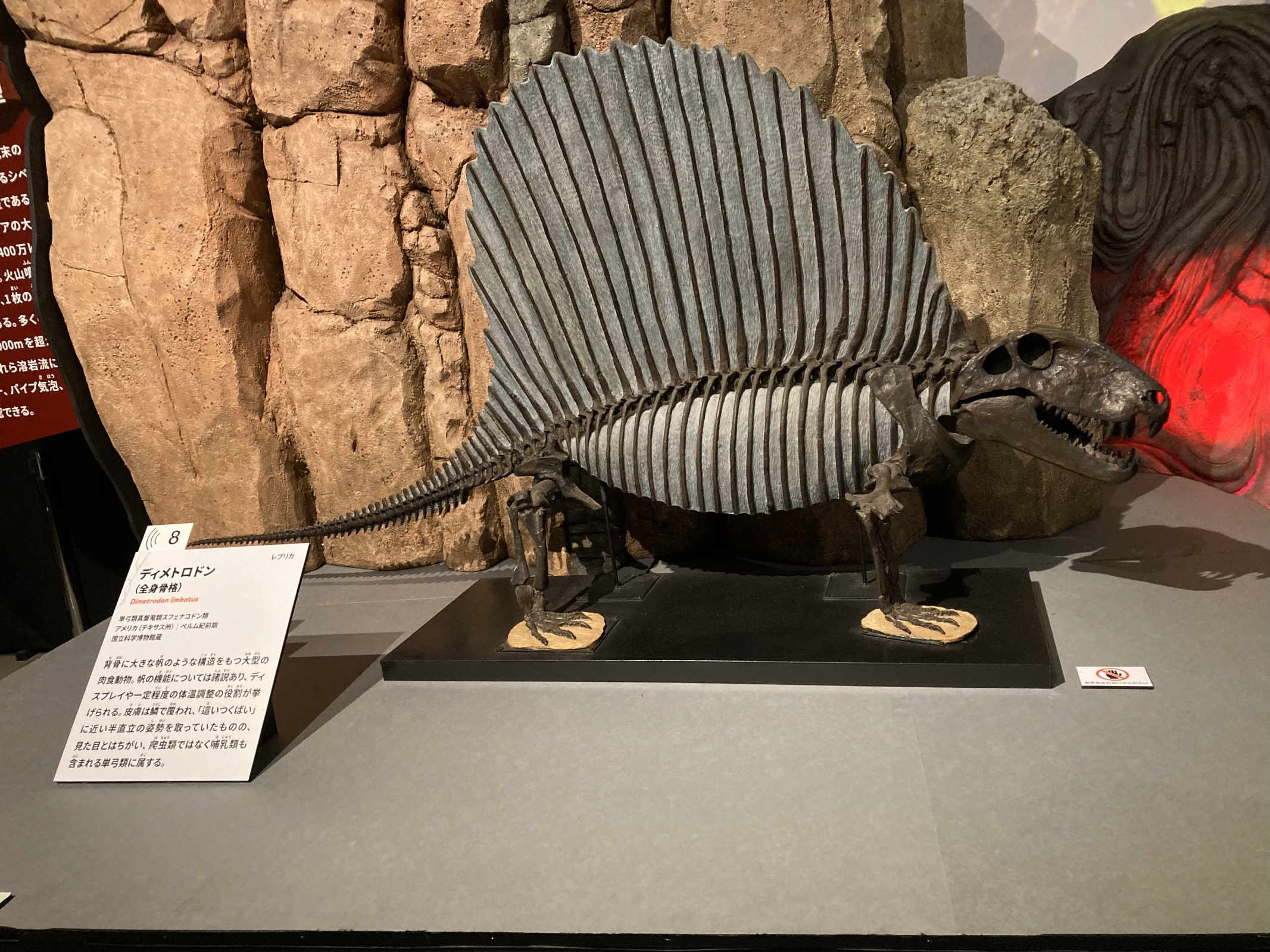 左写真は、ディメトロドンの全身骨格のレプリカ。恐竜どころか爬虫類ですらない、単弓類に属する生物。私は昔から好きである [^.^]。次の写真の手前側は、レドンダサウルスの全身骨格のレプリカ。その次は、クリオロフォサウルスの全身骨格のレプリカ。