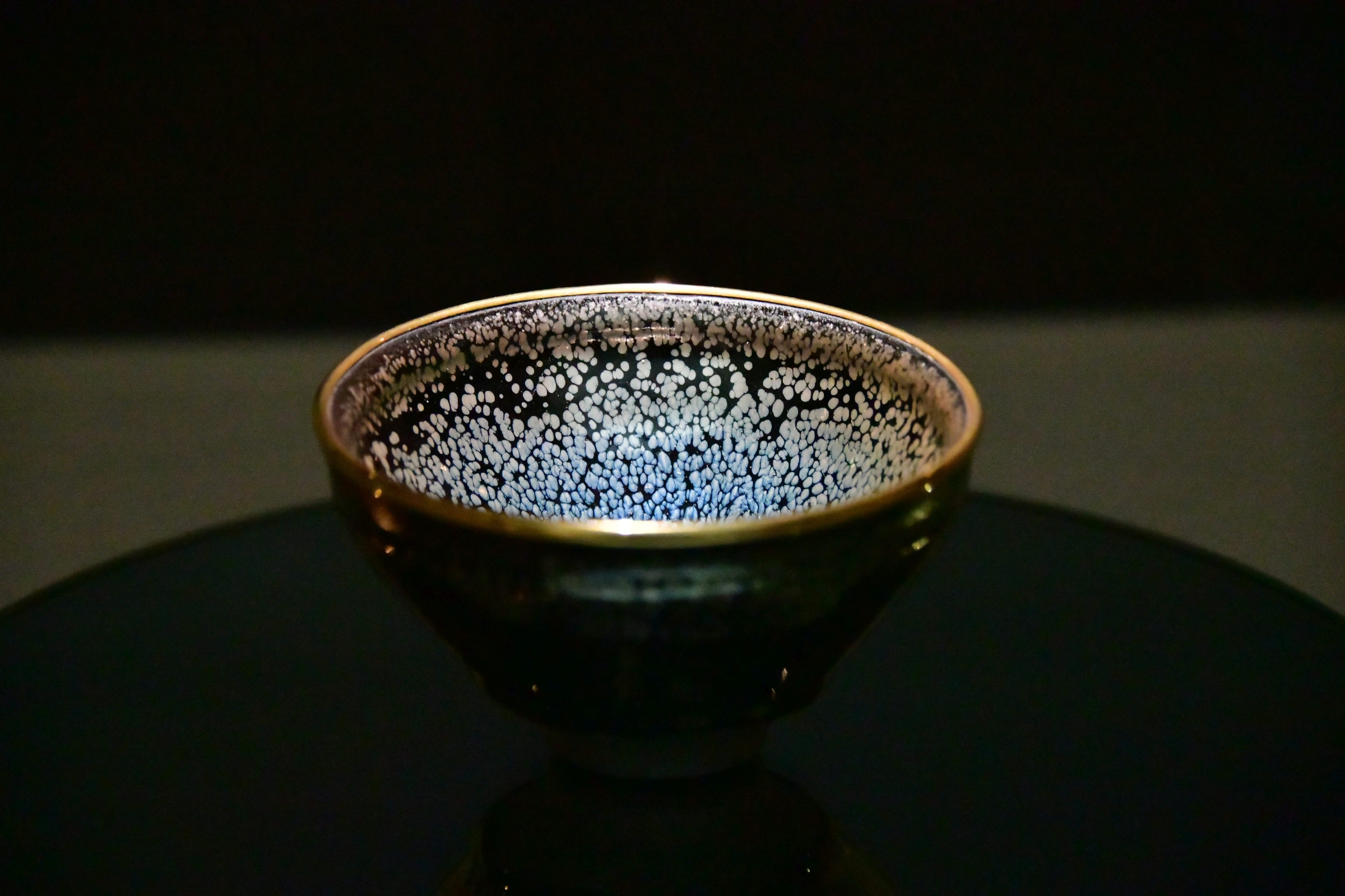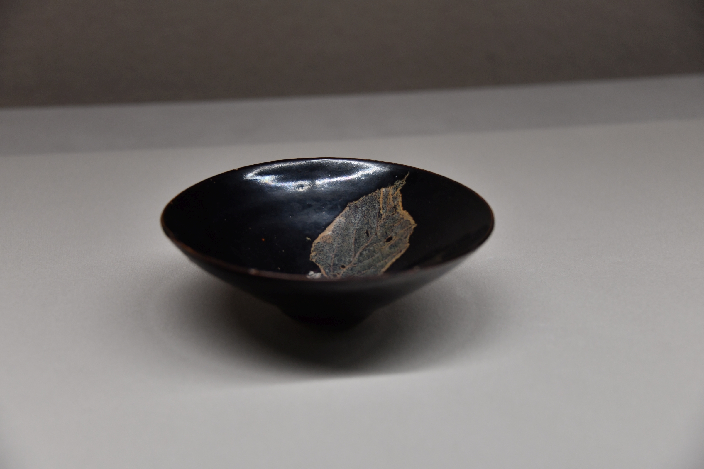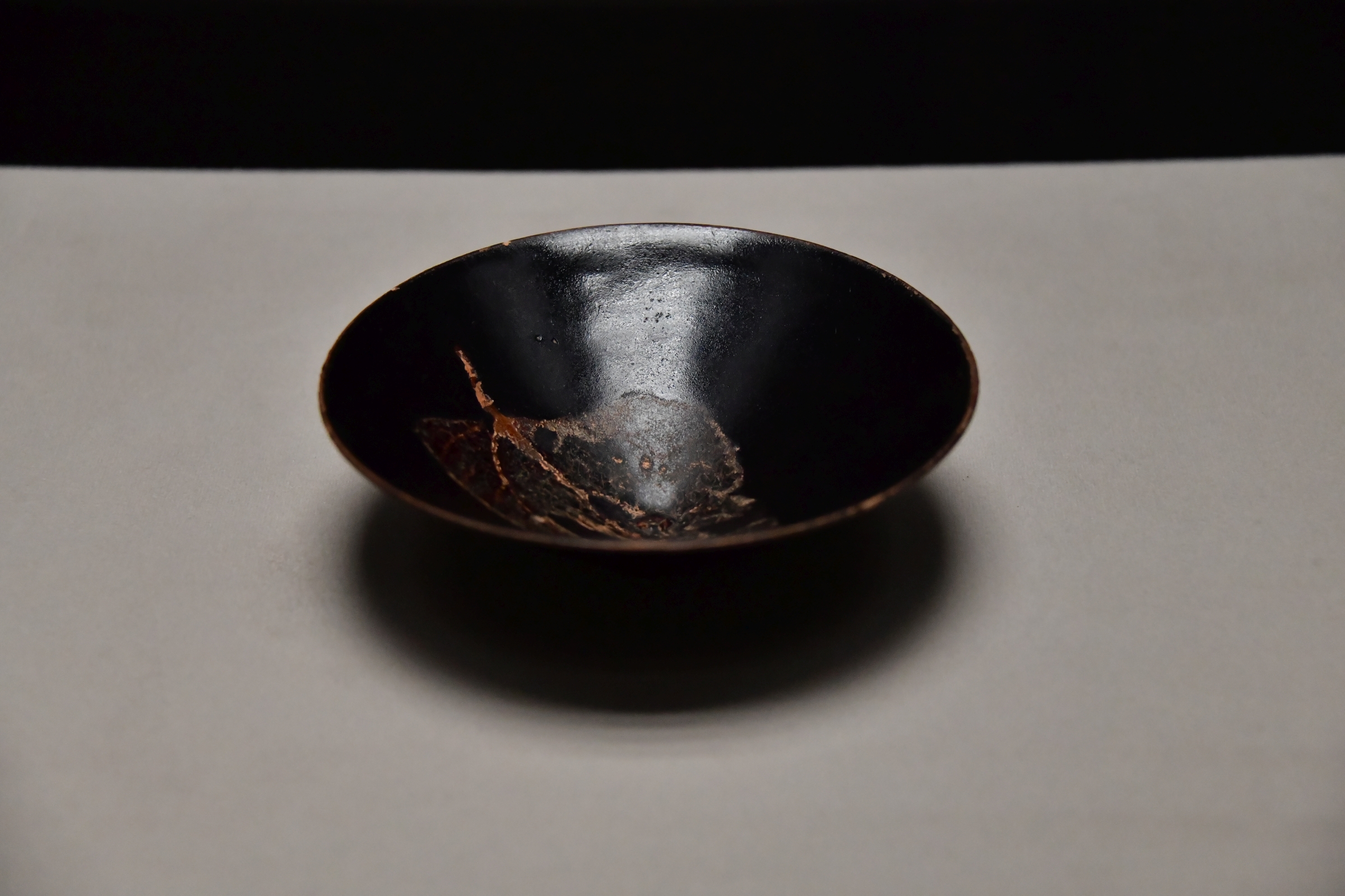 左端の「油滴天目茶碗」は、国宝。実に美しいのだが、撮影がなかなか難しい。次の2点は、いずれも「木葉天目茶碗」で、実物の木の葉を焼き付けている。右写真の方は重文。