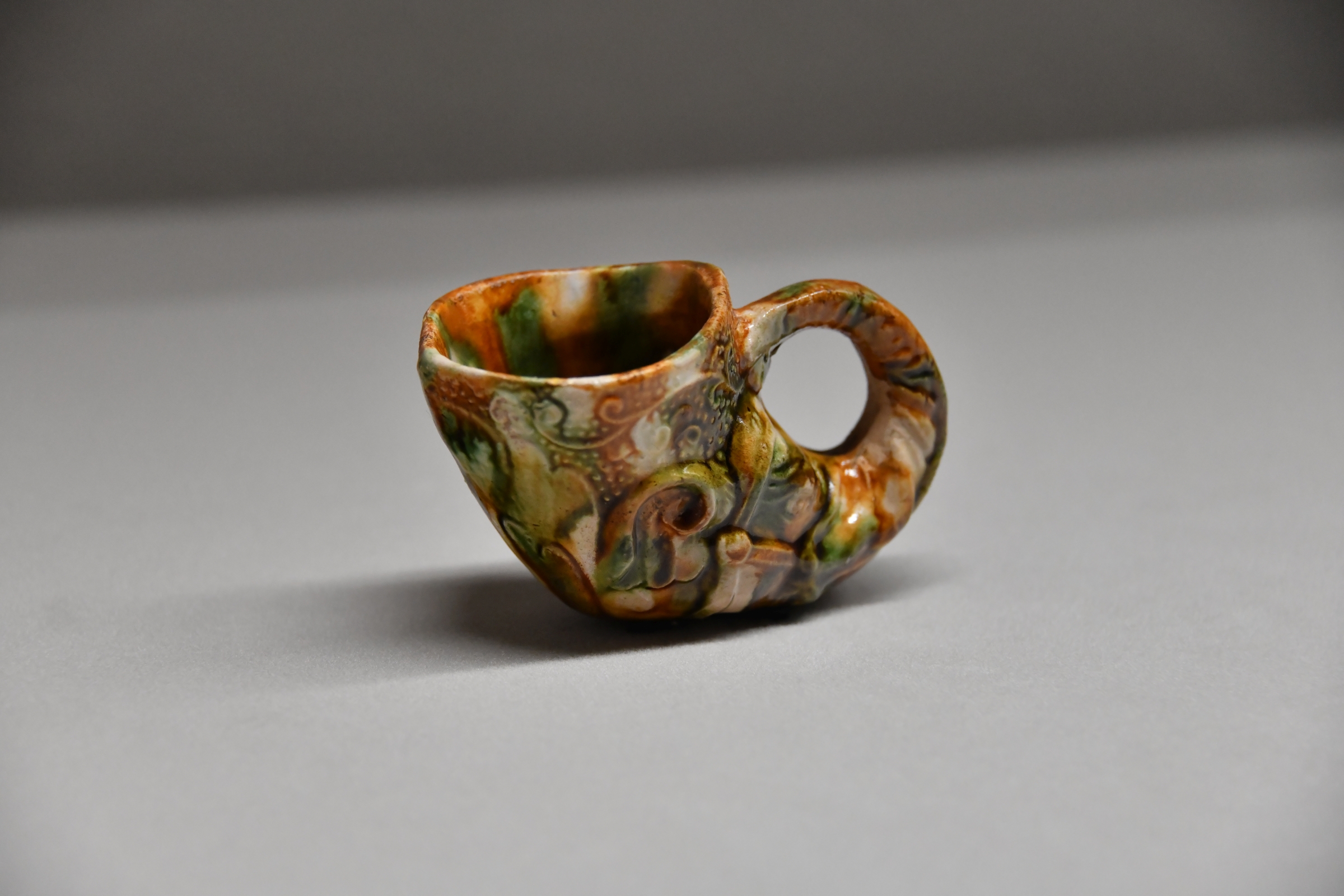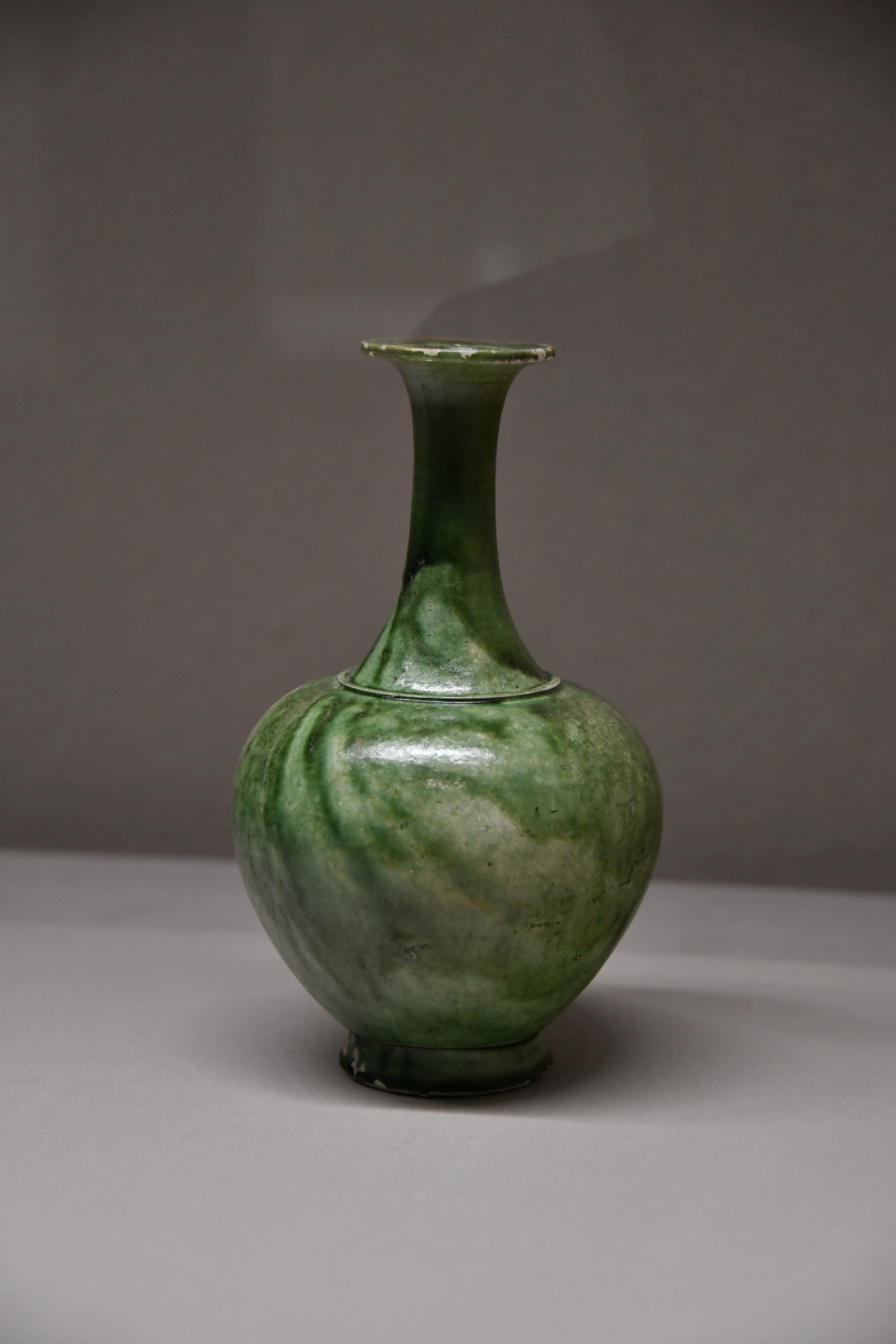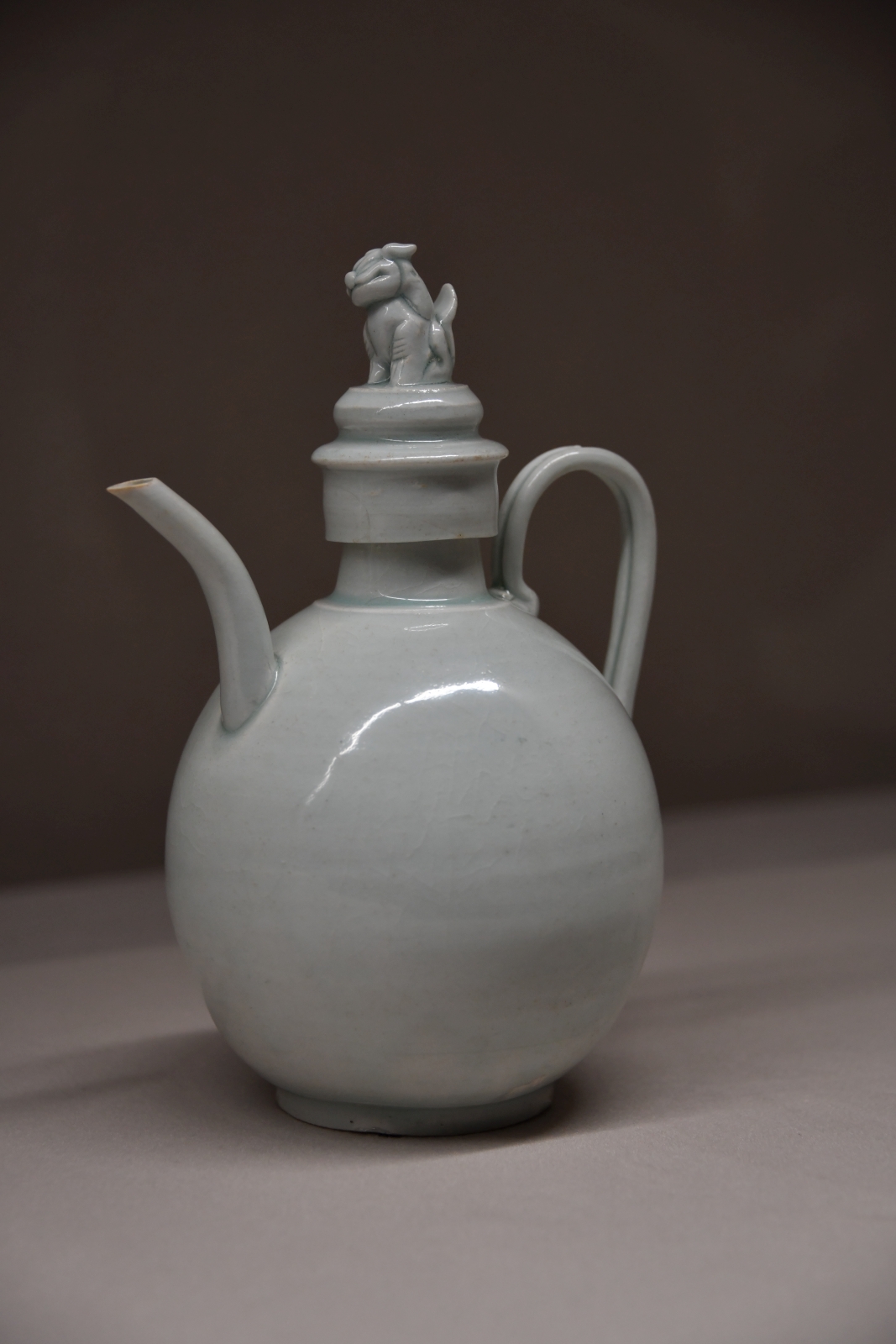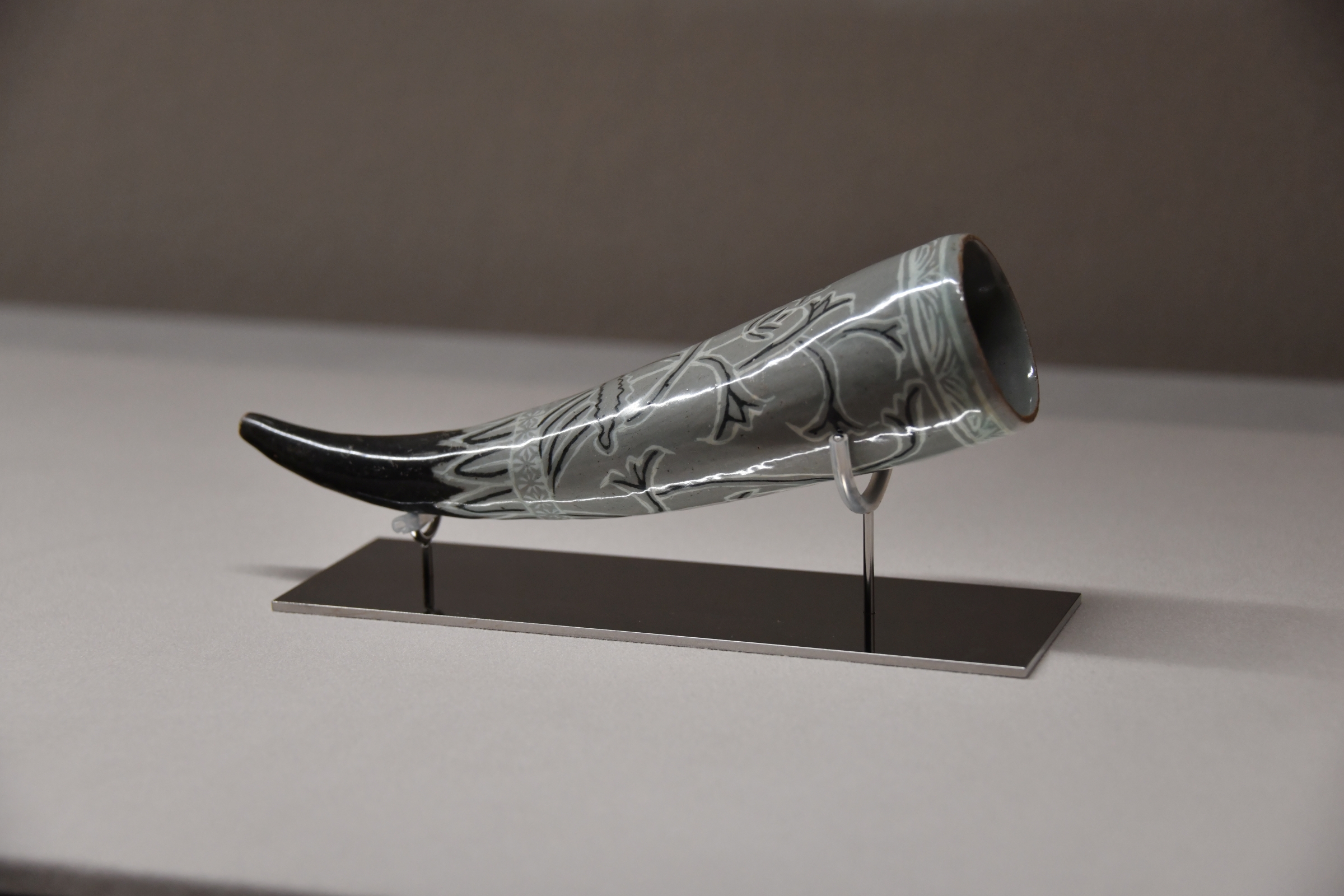 左から、「緑釉 長頸瓶」、「青白磁 獅子蓋水注」。次の2点は角杯(リュトン)あるいはそれを模したものであり、「三彩 象頭形 リュトン」、「粉青象嵌 蓮花文 角杯」。角杯ってカッコイイので、何かいいものがあれば普段使いに買いたくもあるのだが、これほど普段使いに適していない杯もないからなぁ..形状的に。[;^.^]