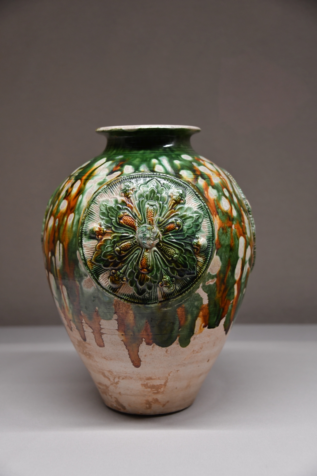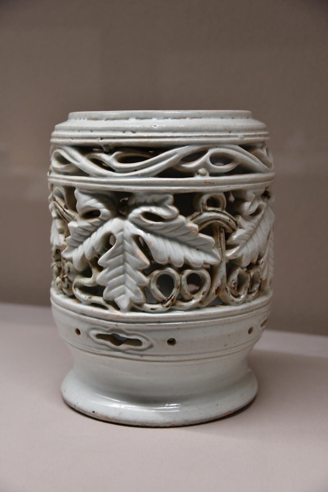 左端の「白磁透彫鉄砂 葡萄文 盆台」は、植木鉢を乗せるためのもの。「青花透彫 龍文 紙筒」は、紙(巻紙)を入れておくためのものかな。右端は、「三彩貼花 宝相華文 壺」。