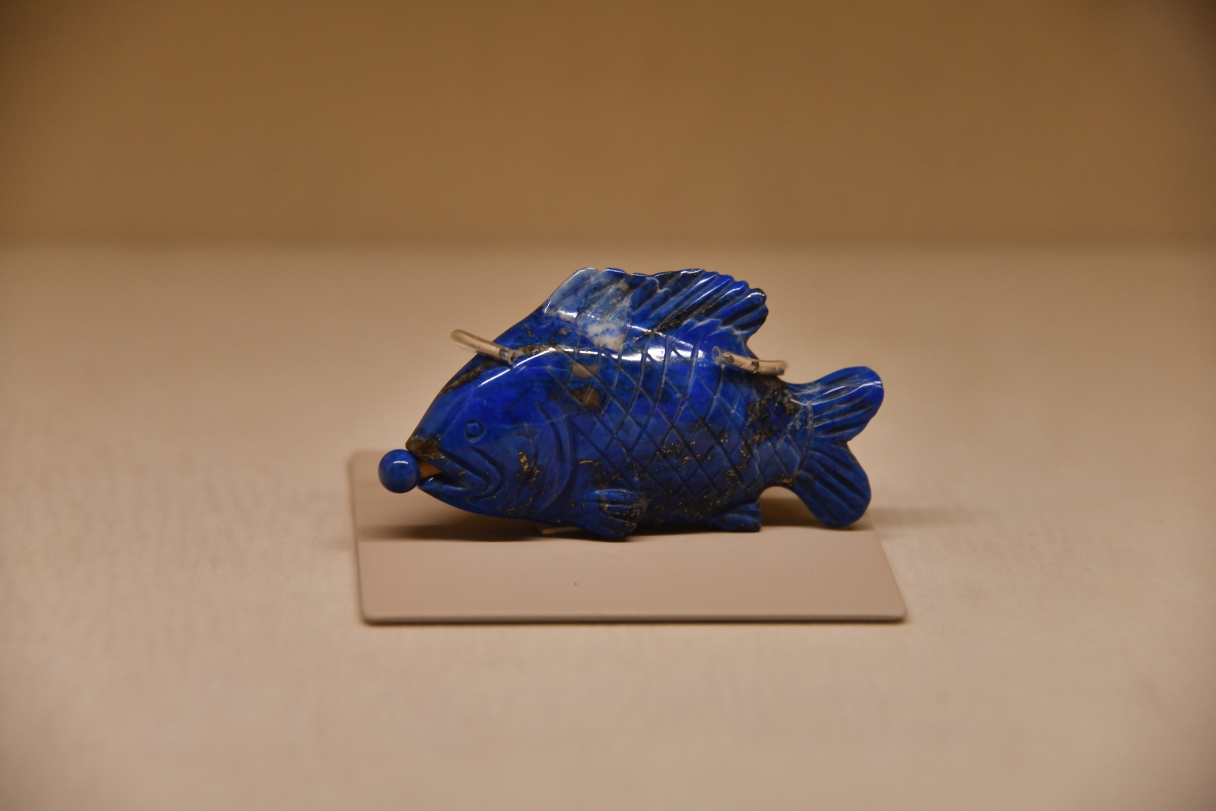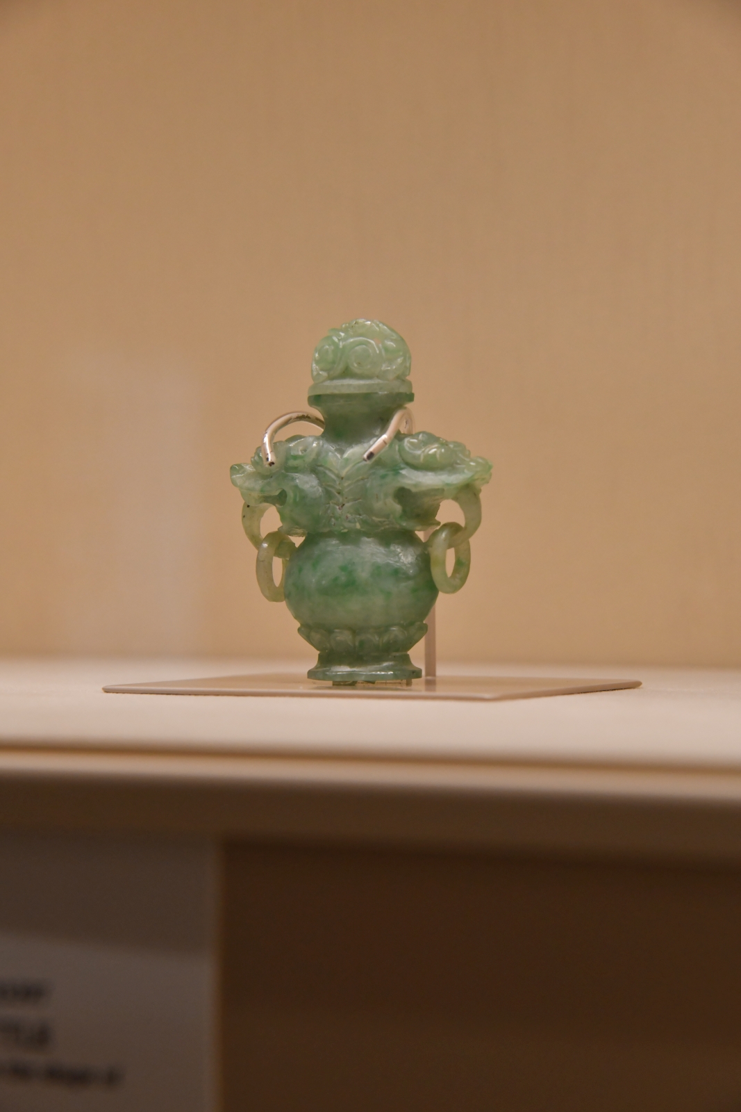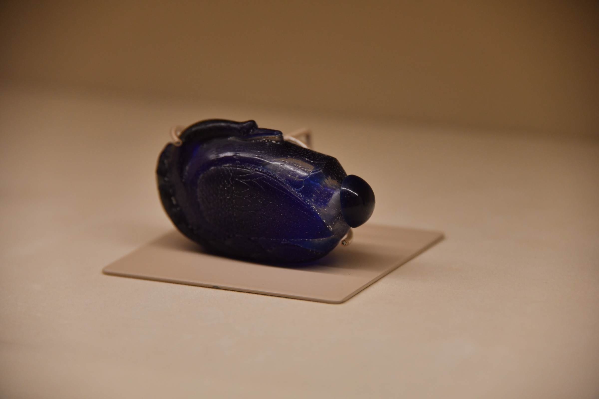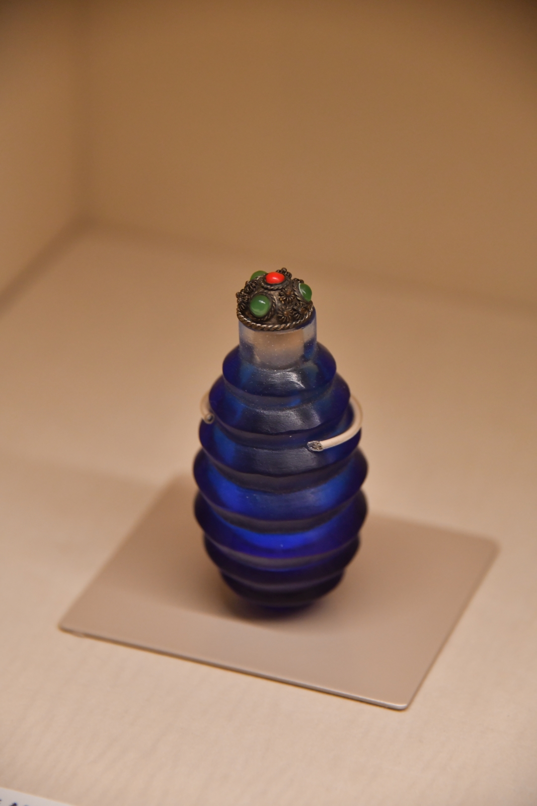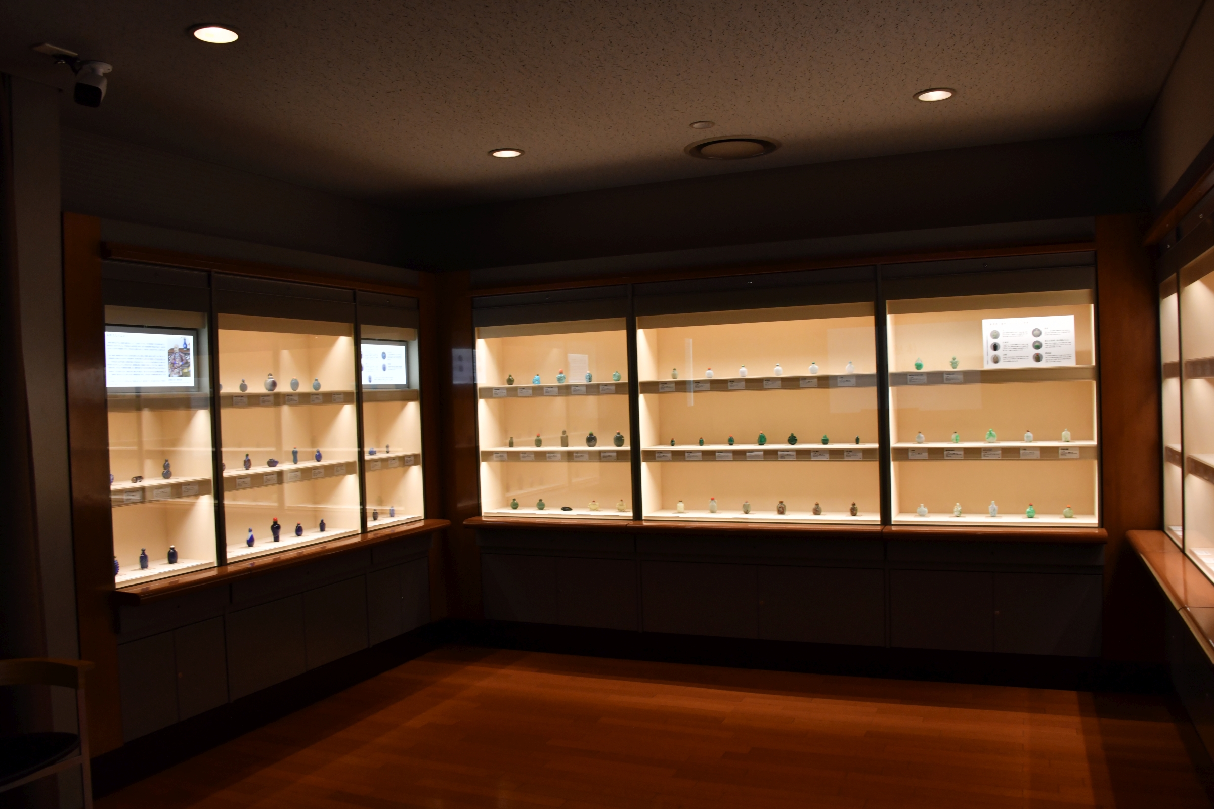 「沖正一郎コレクション鼻煙壺」の部屋。鼻煙壺とは、嗅ぎタバコを入れる小型の容器。左から、「玉 龍耳遊環 鼻煙壺」、「ラピスラズリ 魚形鼻煙壺」、「透明地青被玻璃 輪積形鼻煙壺」、「透明地青被玻璃 水禽形鼻煙壺」。