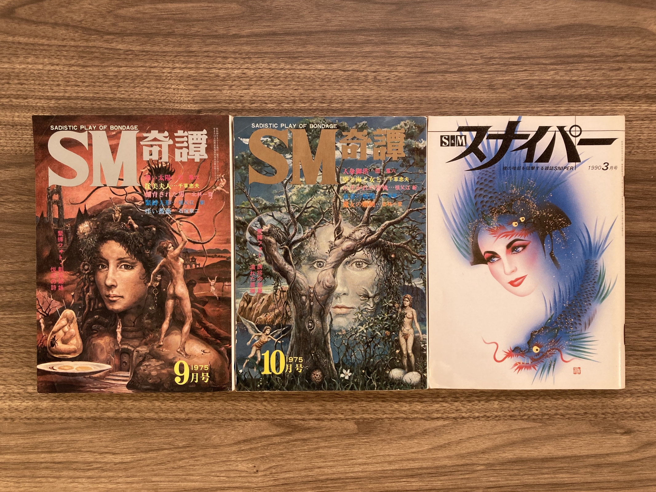 SM奇譚(今の所2冊)は、ジャケ買いである [^.^]。この時期の同誌の表紙絵は秋吉巒(あきよしらん、Wikipedia、画像検索結果、幻想美術選)で、少なくともこの2点は彼の画集にも収録されていない。同誌の古書価は廉くなく、片端から買い集めるという訳にもいかないのが、悩みどころである。