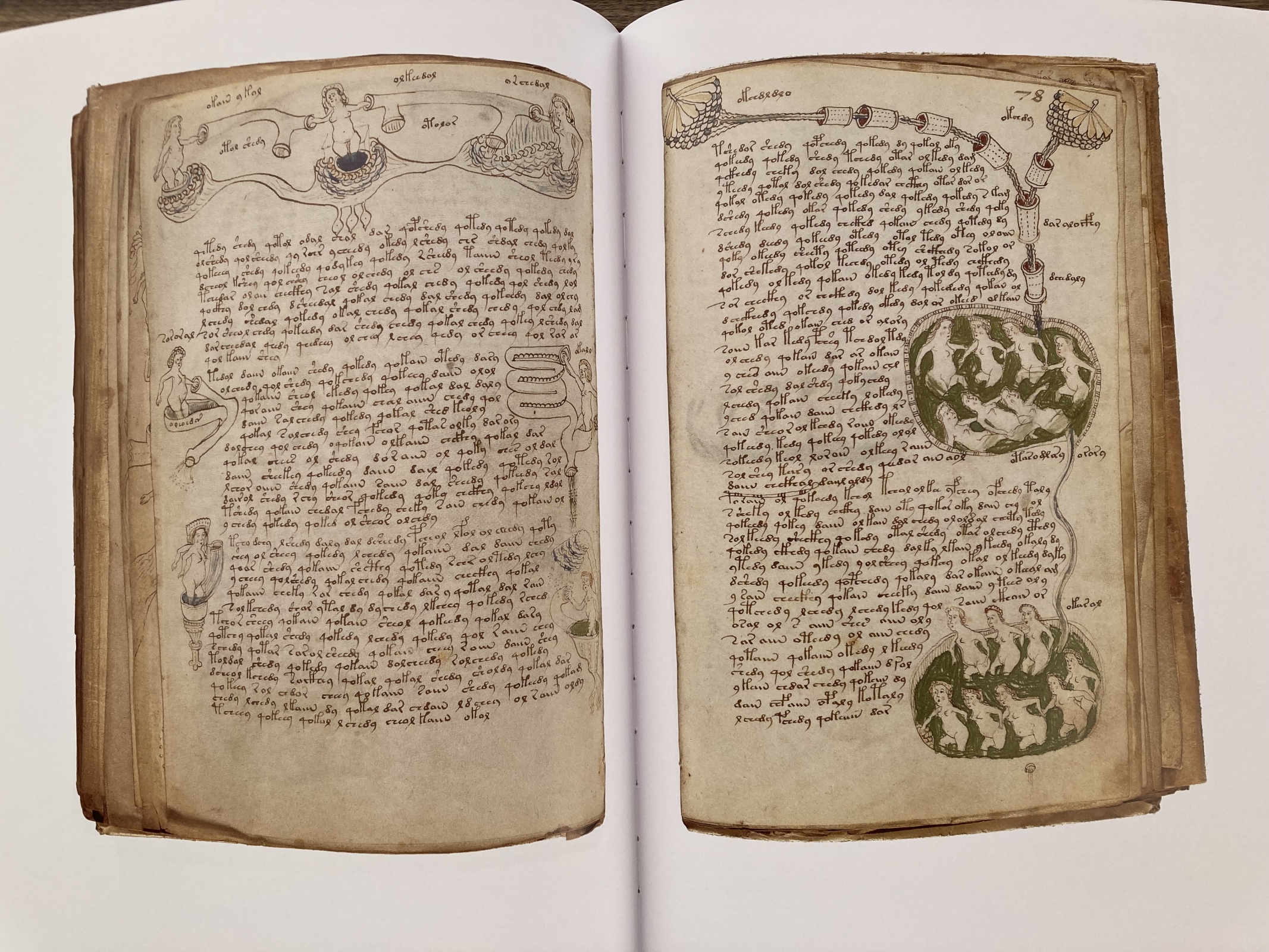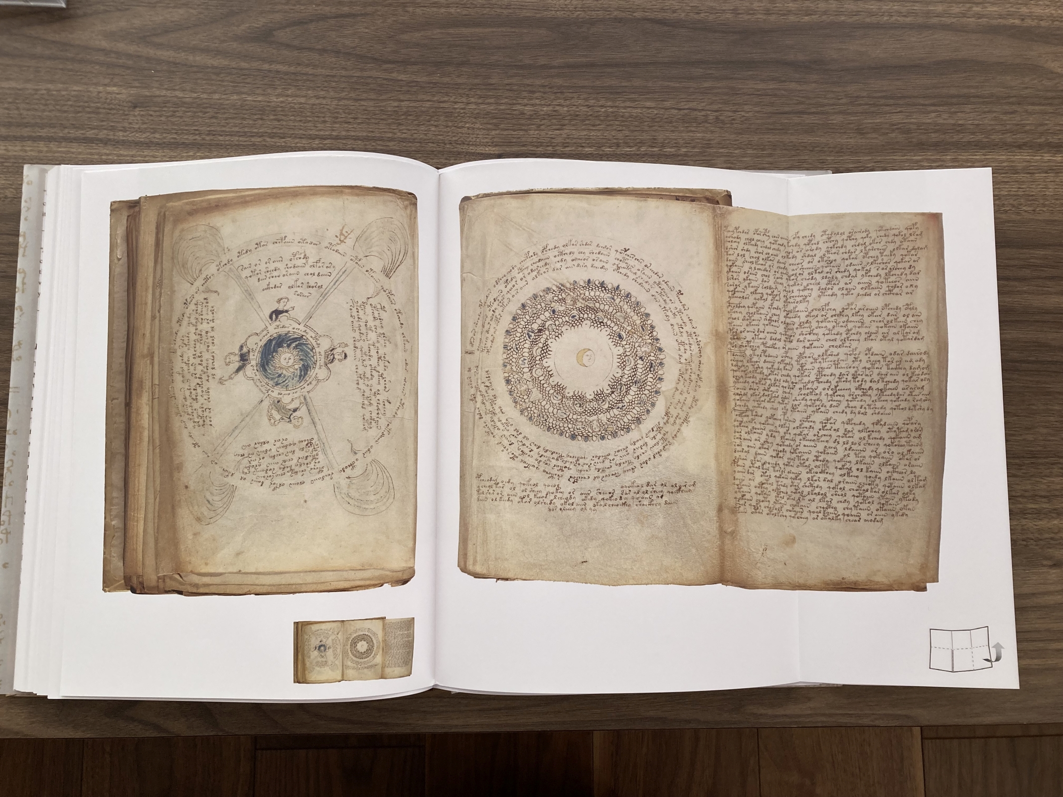 2025年11月04日:「ヴォイニッチ写本」「ヴォイニッチ写本」(Wikipedia、画像検索結果)が、届いた。一部のアレな人 [;^.^] 以外はご存じないかと思うが、意味不明な絵が多数描かれている、いまだに解読できていない奇妙な文字(記号)で記述されている、世界で最も謎めいた写本。以前から「ヴォイニッチ写本 世界一有名な未解読文献にデータサイエンスが挑む」(安形麻理、星海社、Amazon)などの解説書は読んでいたのだが、この際、原本..は無理なので、その精密なレプリカを手元に置いておきたいものだと、ファクシミリ版「The Voynich Manuscript」(Amazon)を購入したのである。