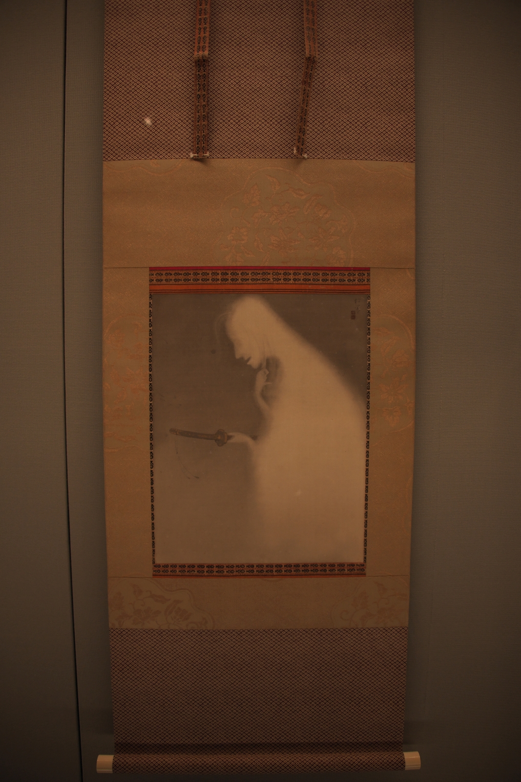 左から、窪俊満の「花魁と禿図」。上村松園の「浴後美人図」は、やはり品が良い。同じく「雪女」は、この画家には珍しい画題。近松門左衛門の「雪女五枚羽子板」に登場する侍女が、落命後、生前の恋人の危機を救うために雪女となって現われたところ。こんな姿であっても、確かに健気な「美女」の図であると、染み入ってくる。