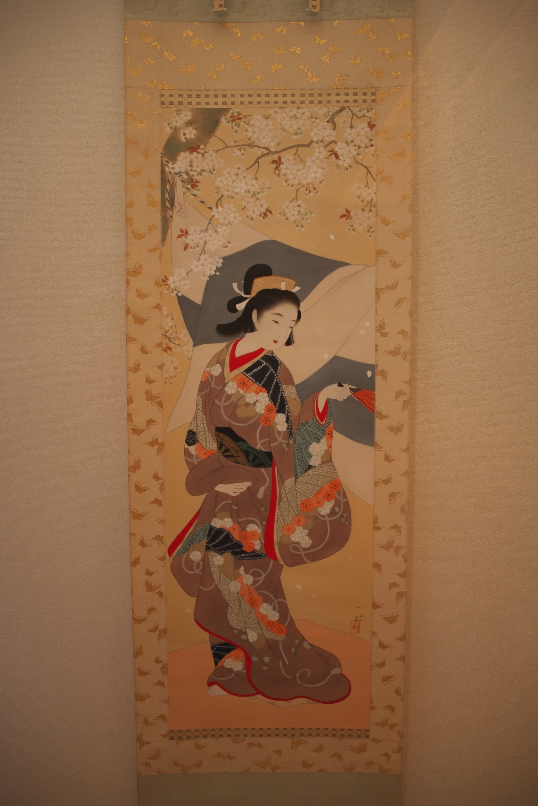 左から、梅翁軒永春の「雪卯模様着衣立美人図」。伊藤小坡の「花見之図」。撮影不可の作品では、鏑木清方の「宇治の蛍かり」、小川雨虹の「鏡獅子」(画像検索結果)など。
