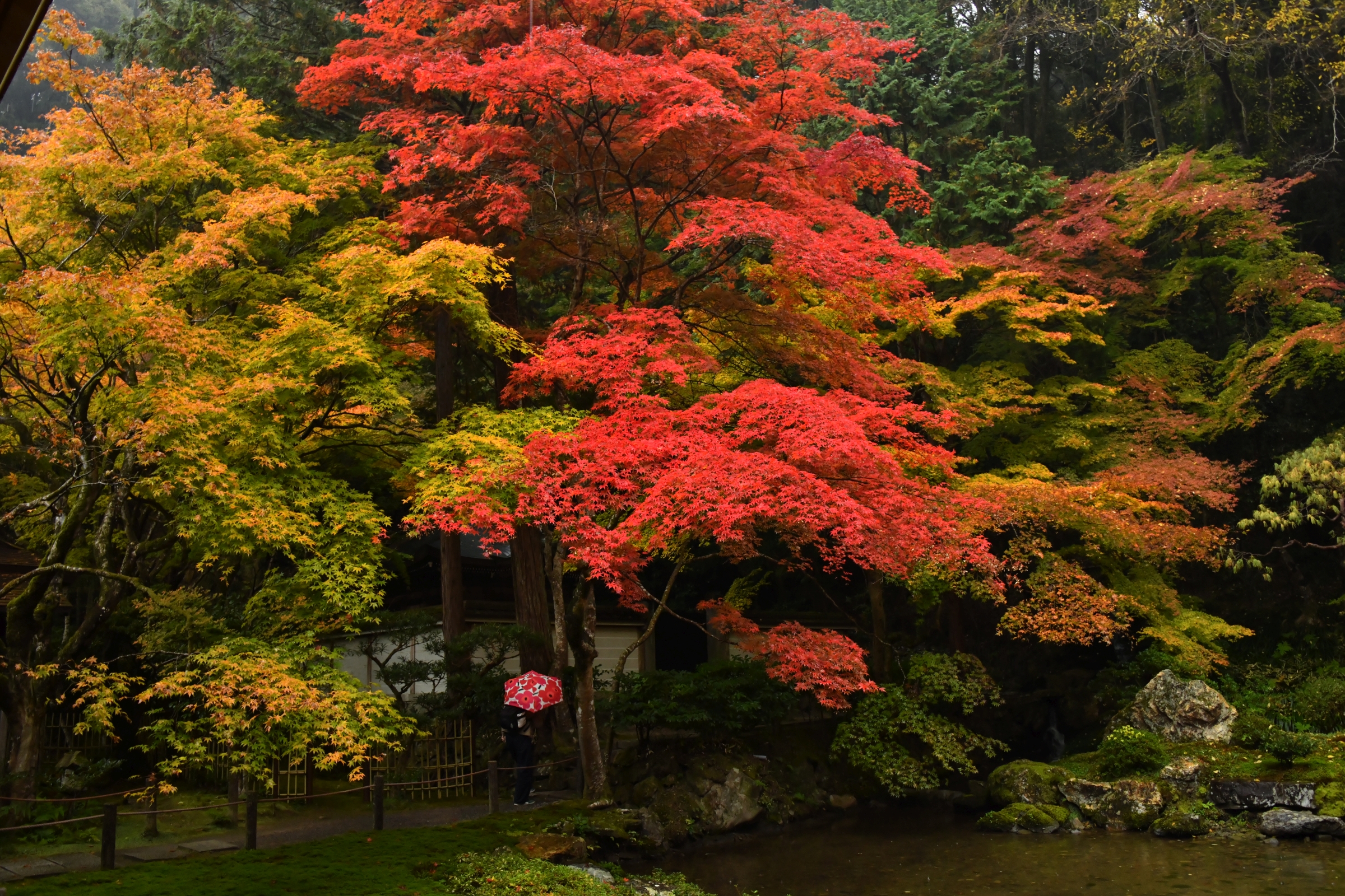 予定より20分押して9:10に南禅寺を発ち、10分歩いて、永観堂。この3枚は、いずれも「放生池」周辺で撮ったもの。右2枚は山の中腹の「多宝塔」を望む。この池の回りの夜間ライトアップも有名であるが、どんよりと薄暗い昼間の雨中の潤いもまた、格別である。[^.^](水面に注目。そこそこ降っているでしょぅ。)