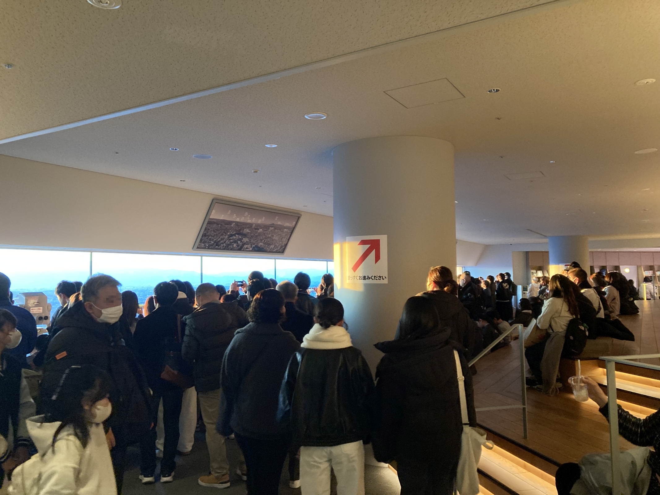 ちなみに、レンズフードによる映り込み防止撮影をするときは、窓際に陣取って、レンズフードをガラスにくっつけなければならない。私は、見物客の人波(時間帯は違うが、左写真のようなありさま)の後ろについて、前の人が少しずつ離脱していくのを辛抱強く待ち、窓際につけたら、レンズフードを窓ガラスにあてて、手際よくさささっと、複数回シャッターをきり、おおむね1分以内には離れて下がり、液晶モニターで確認して、いまいちだったらループの最初からもう一度、という段取りを踏んでいる。この最低限の作法、できてる人も少なくないんだけど、なかにはね..