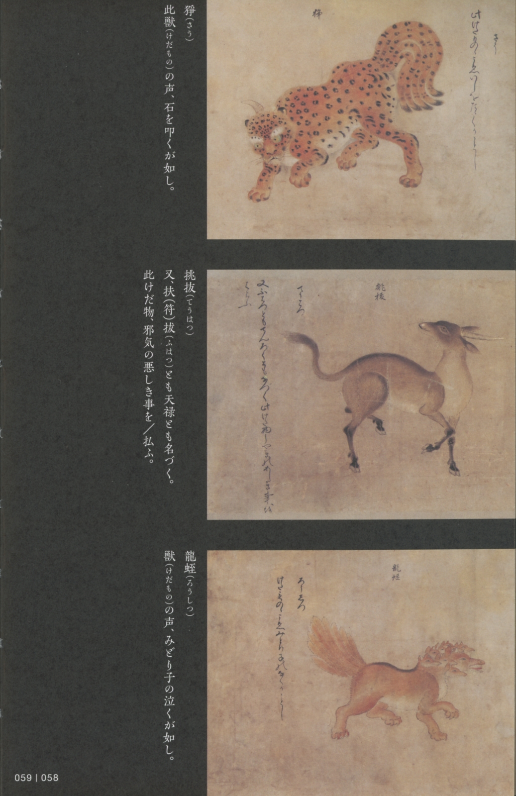 「加彩鎮墓獣」−左端写真は、展覧会場で撮ったもの。次の2枚は、図録からのスキャン。鎮墓獣とは邪気を払う聖獣であり、同じ役割の狛犬とは異なり、地下、あるいは墓の内部におかれる。スフィンクスに似ているとは言える。