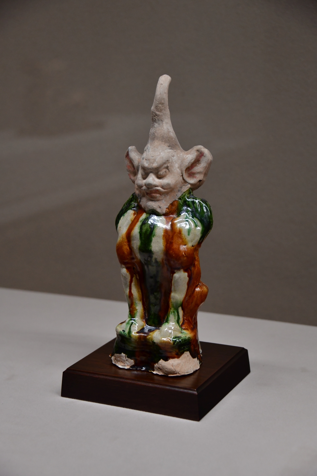 左から、「三彩 鎮墓獣」−鎮墓獣は、静嘉堂文庫美術館にも居ましたね [^J^]。「加彩 天王俑」−天王俑は、鎮墓獣どうよう、墓の入口を守るもの。「加彩 婦女俑」は、この美術館のマドンナであり、回転するお立ち台に乗っている。