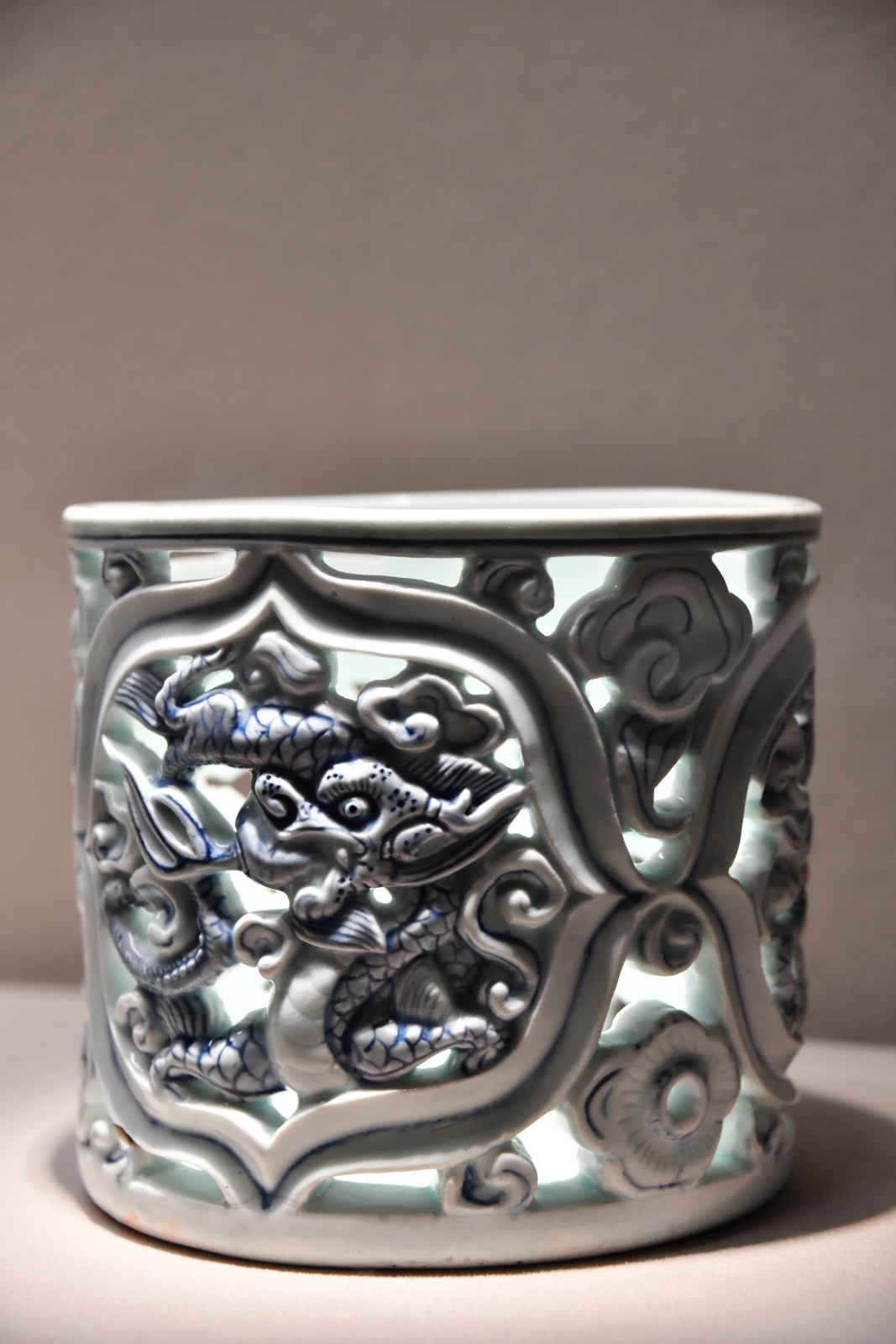 左端の「白磁透彫鉄砂 葡萄文 盆台」は、植木鉢を乗せるためのもの。「青花透彫 龍文 紙筒」は、紙(巻紙)を入れておくためのものかな。右端は、「三彩貼花 宝相華文 壺」。
