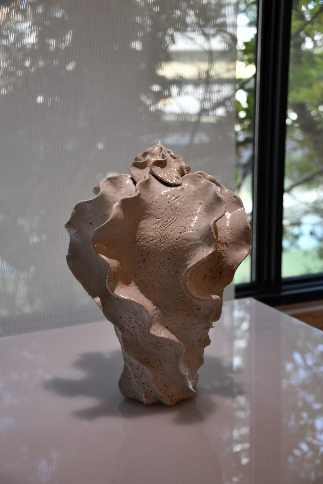 現代陶芸も展示されている。左から、小池頌子の「白の形」、秋山陽の「ZONE I」、同じく「Heterophony 2」。