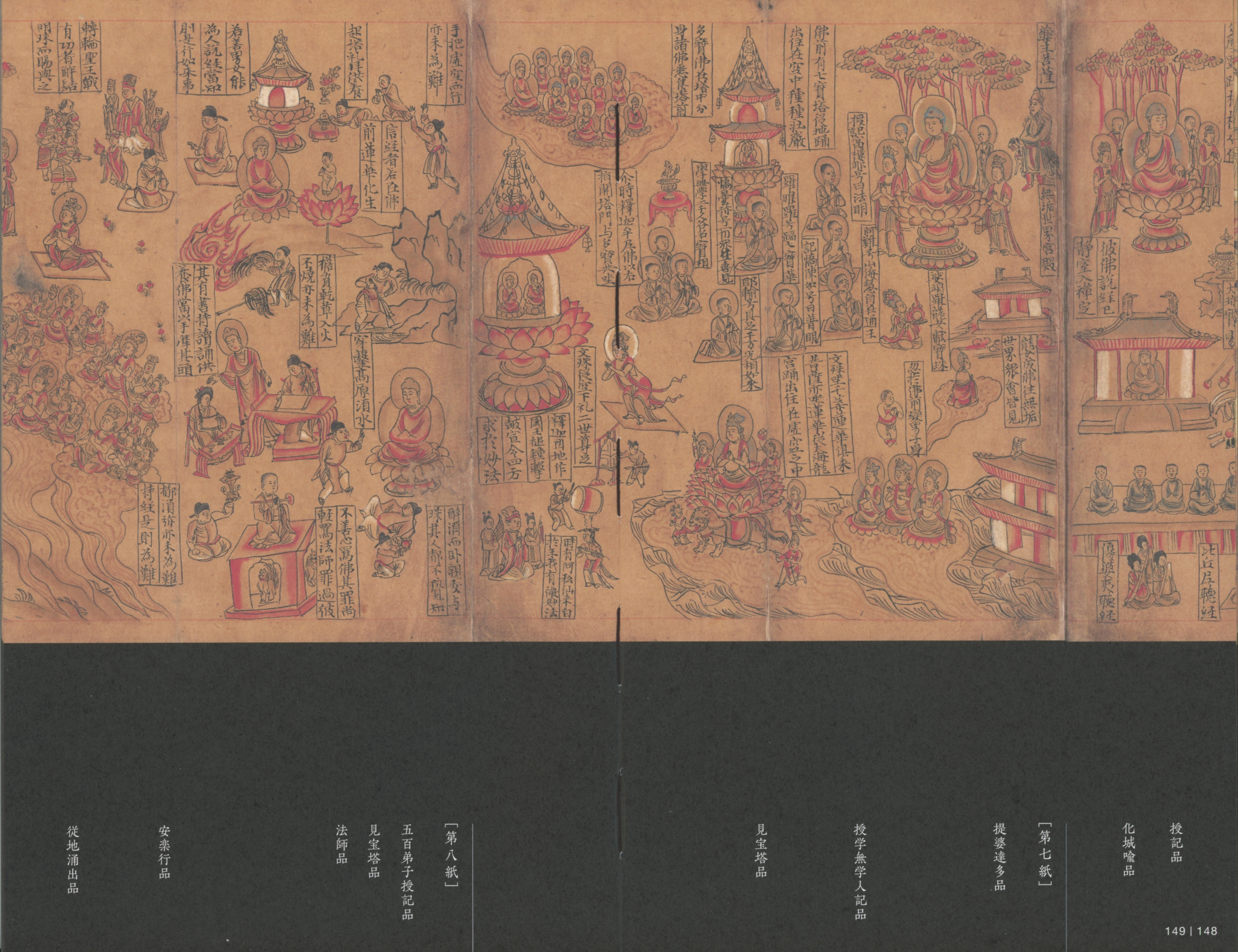 「妙法蓮華経変相図」−法華経の「諸品(しょほん=全28品(章)からなる『妙法蓮華経』の各章のこと)」を絵画化した変相図(Wikipedia)。(右から左へ観てください。)